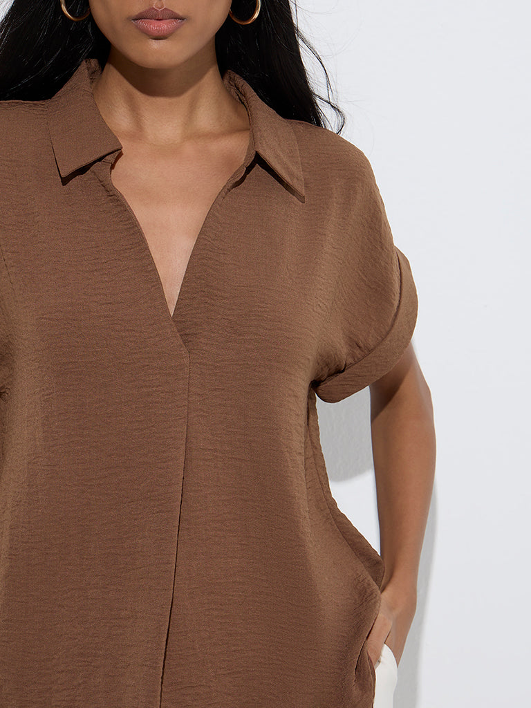 This brown top from Wardrobe is styled with a V-neck collar that flows into a button placket. paired with upturned dolman sleeves for a relaxed yet refined look. Spun from a breathable fabric with a crinkle texture. it exudes effortless sophistication. ideal for both workwear and polished casual outings.