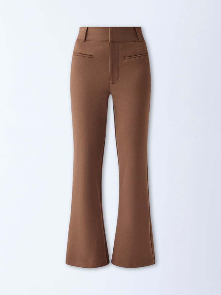 Polished and versatile. these brown high-rise trousers from Wardrobe are tailored from a soft. stretchable fabric that ensures lasting comfort. The buttoned waistband. belt loops. and functional pockets offer a sharp finish. while the flared silhouette adds a hint of modern sophistication.