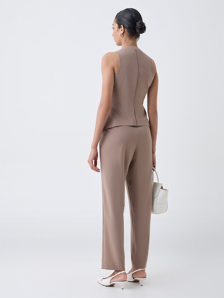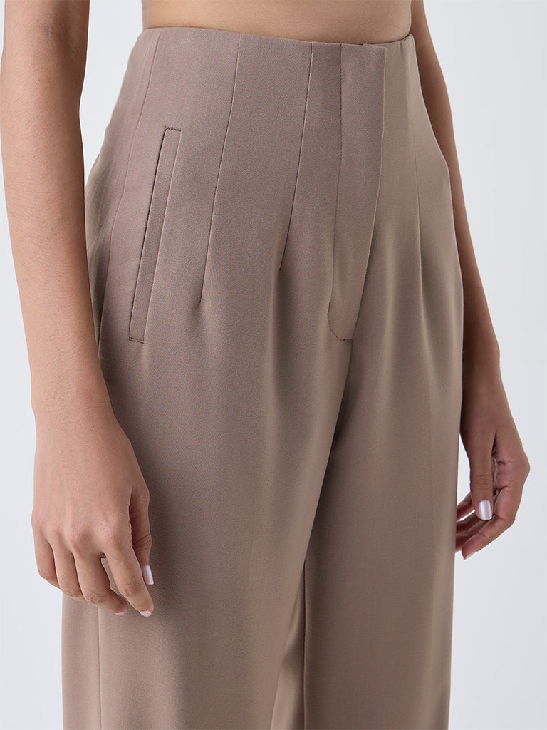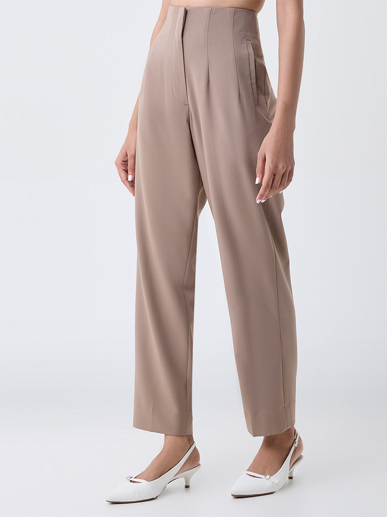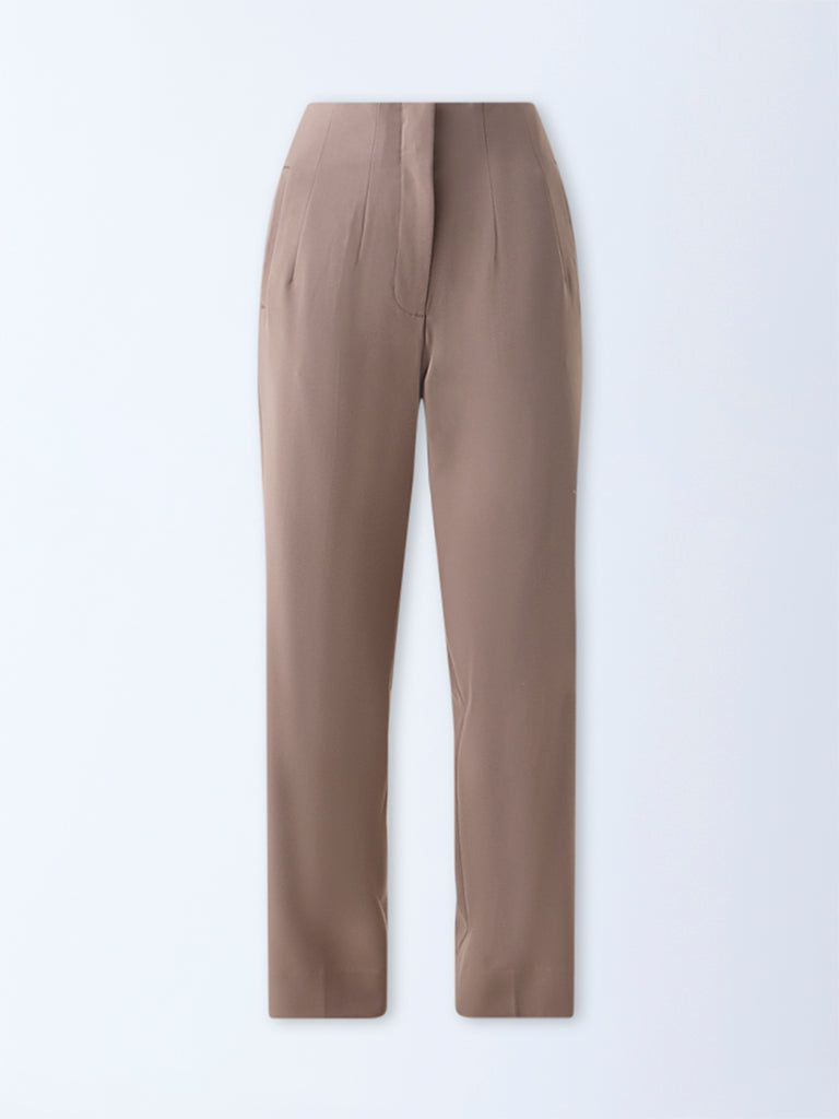 Wardrobe presents this brown trousers framed in a high-rise silhouette carrying a hook closure. a zipper and imitation pockets for a neat finish. Constructed from a breathable fabric. this polished bottom is perfect for pairing with matching blouse and other separates for an elevated appeal.