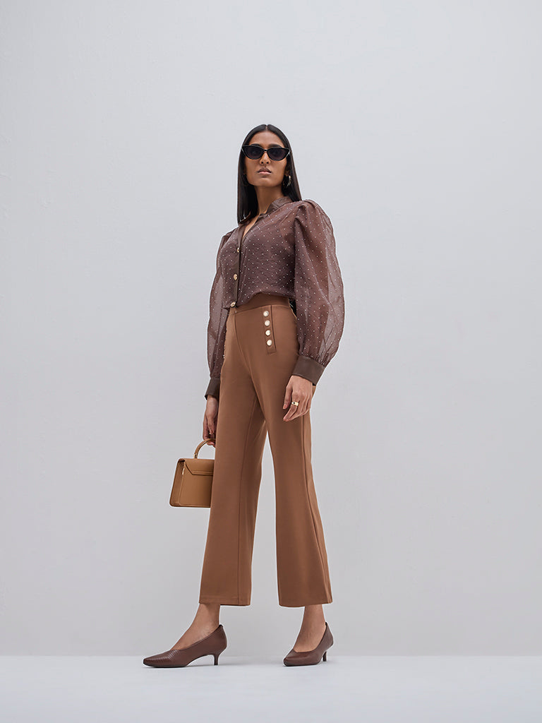 These brown trousers by Vark feature a stylish wide-leg silhouette. The high-rise bottomwear is adorned with gold-toned buttoned detailing. Made with soft and stretchable fabric. it boasts a smooth elastic waistband for a quality fit.