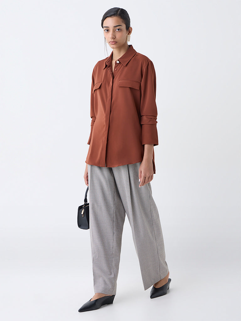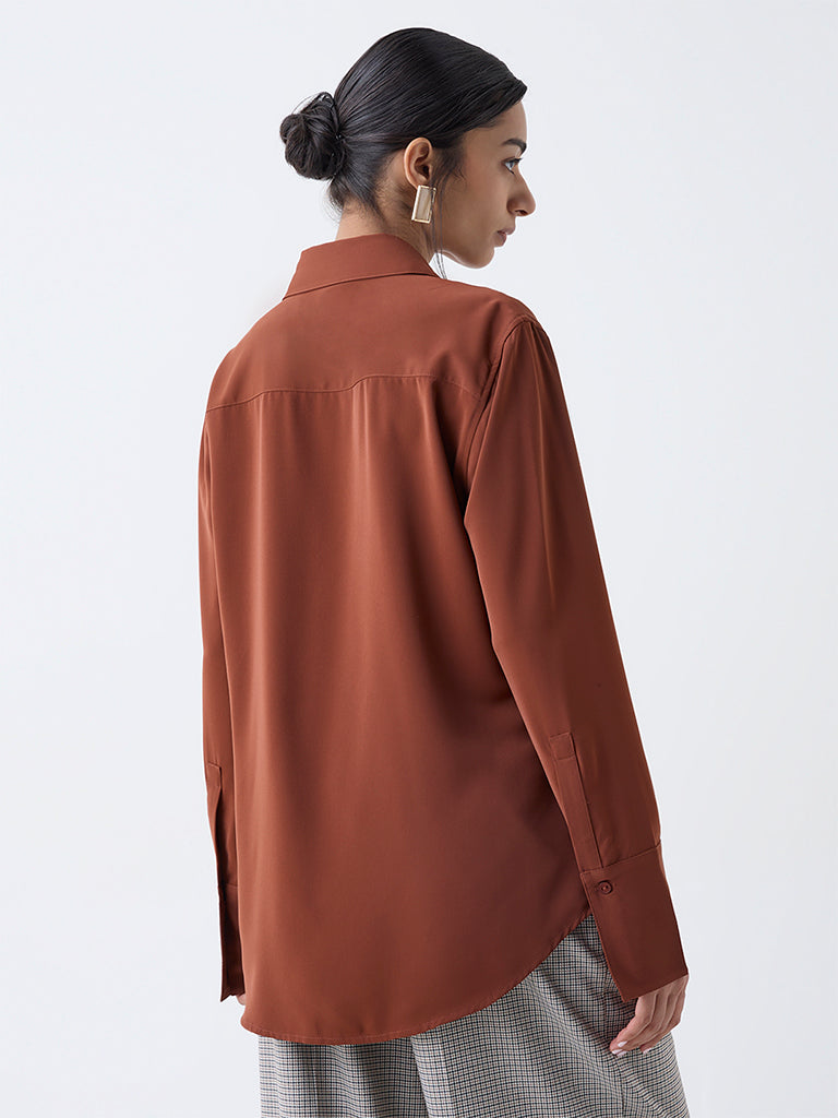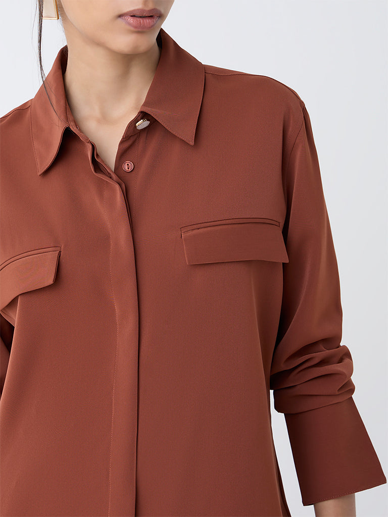 Wardrobe brings this brown shirt featuring a crisp collar. a concealed button placket and full sleeves. It is completed with two imitation pockets in the front for a structured appeal while the soft. breathable fabric composition allows all-day soft feel. A refined piece that pairs effortlessly with tailored separates for a composed look.
