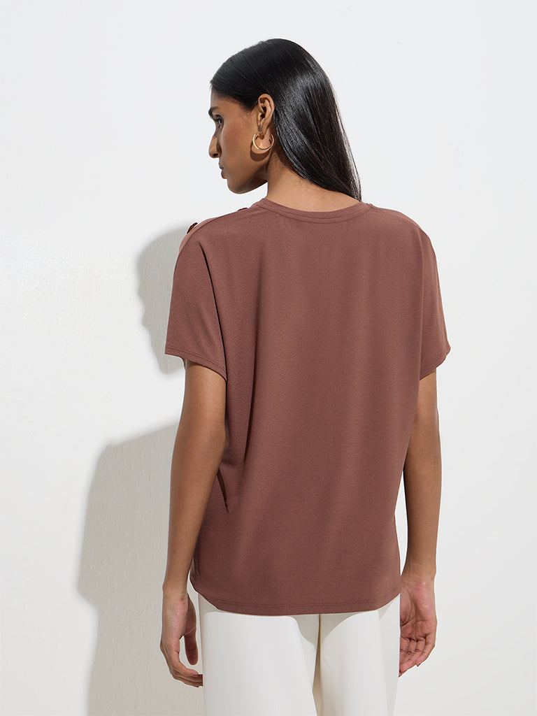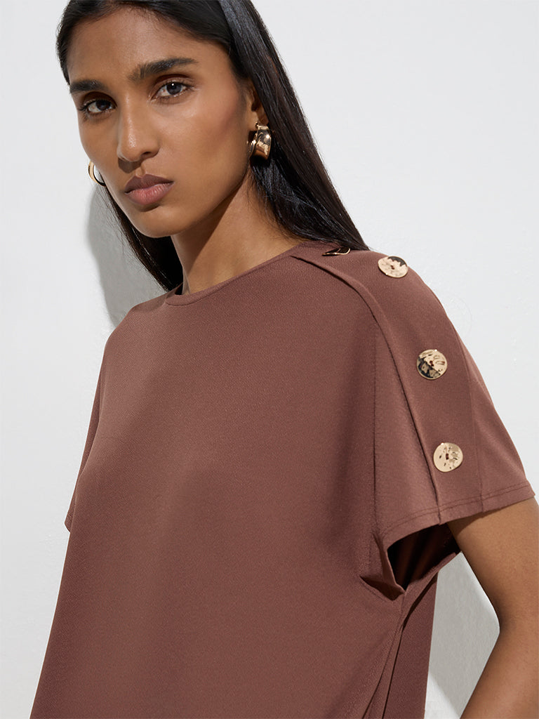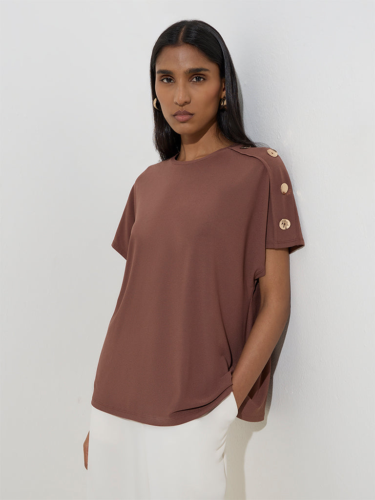 This brown top from Wardrobe is crafted from a soft fabric that feels light against the skin. Designed with a round neck and relaxed dolman sleeves. it’s finished with understated gold-toned buttons that lend a touch of refined charm.