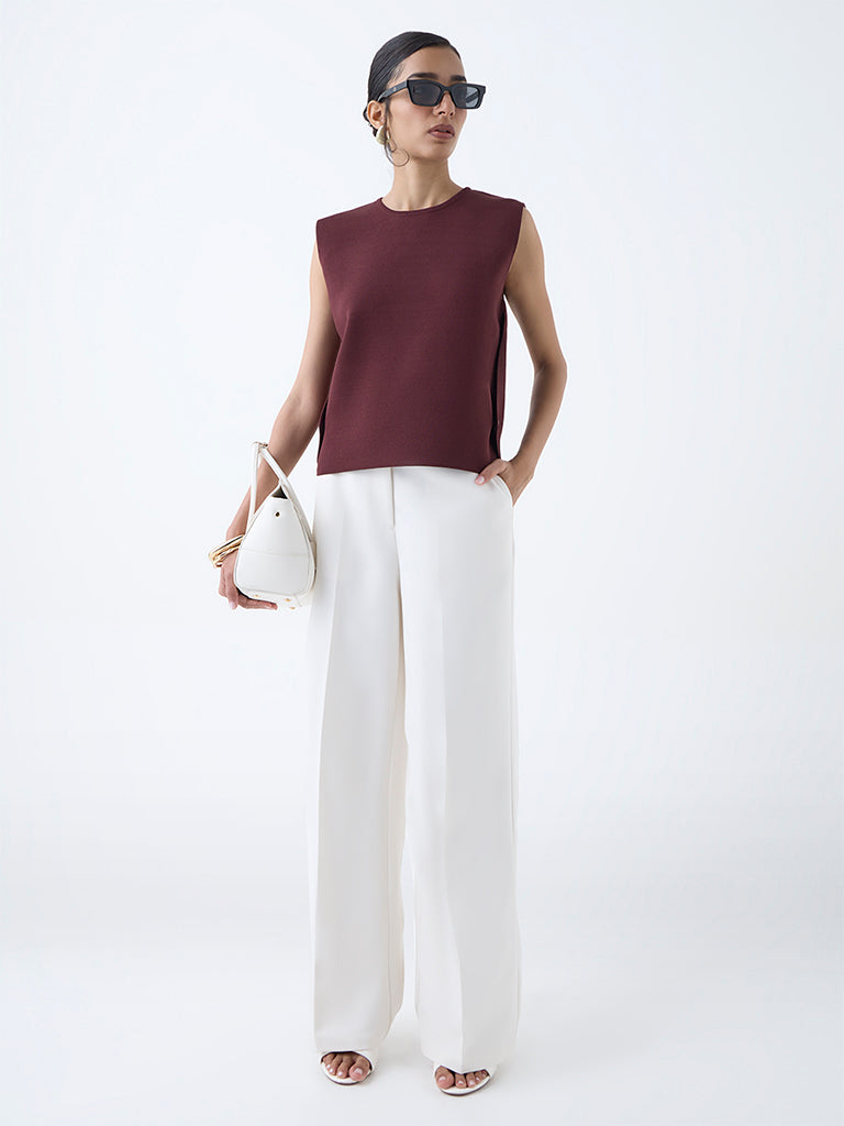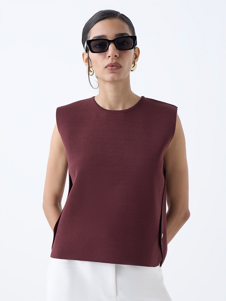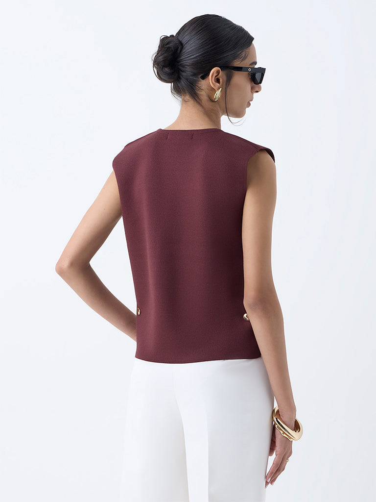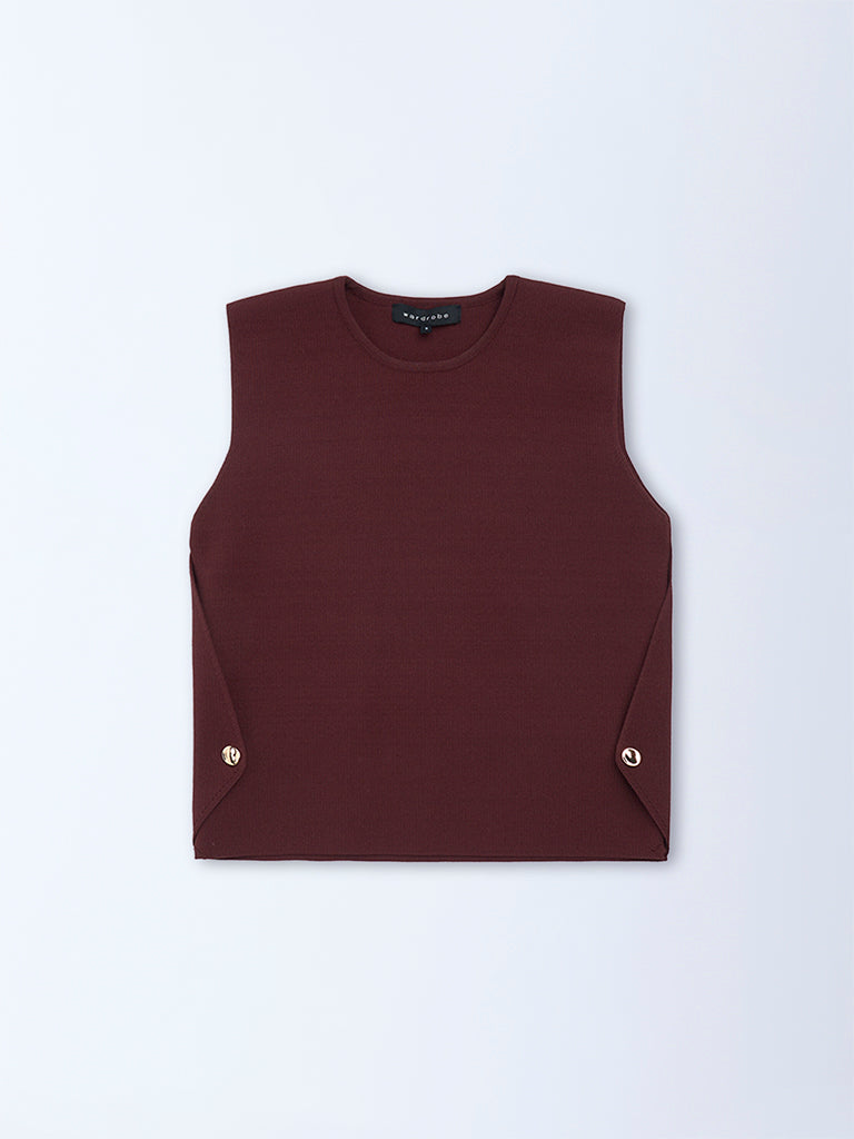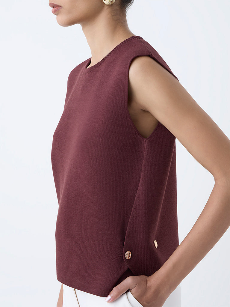 Wardrobe puts a fresh spin on workday essentials with this brown sleeveless top. defined by sleek gold-toned button accents along the sides. Spun from a breathable fabric with a clean round neck. it delivers a minimalist silhouette with just the right hint of polish.