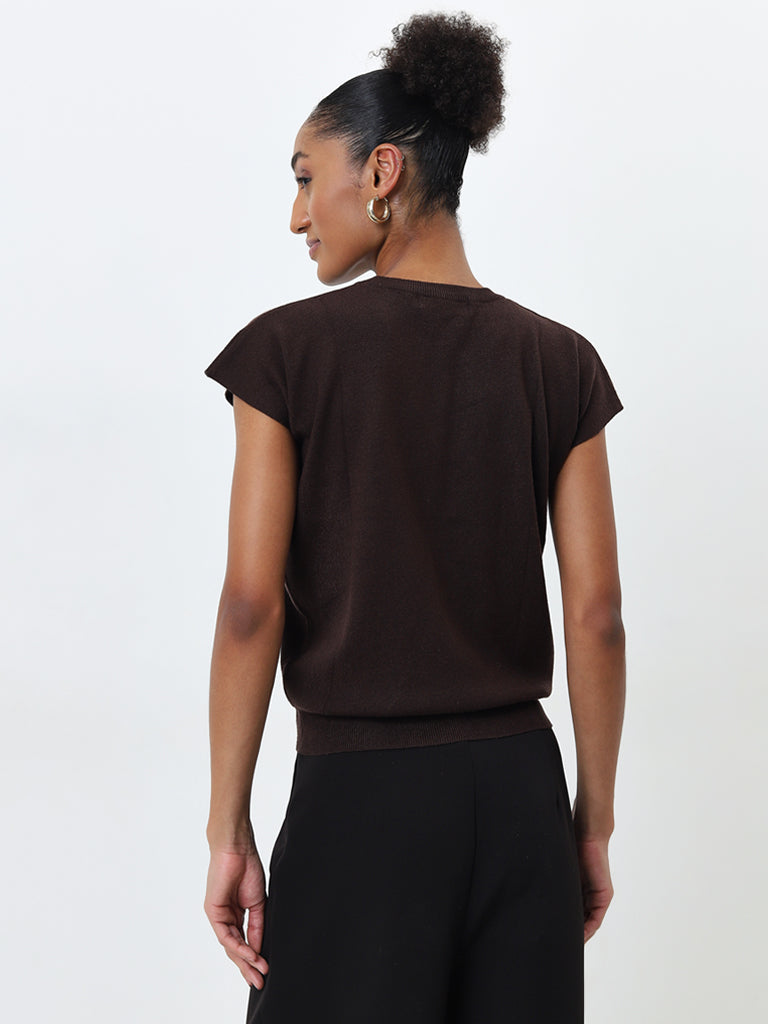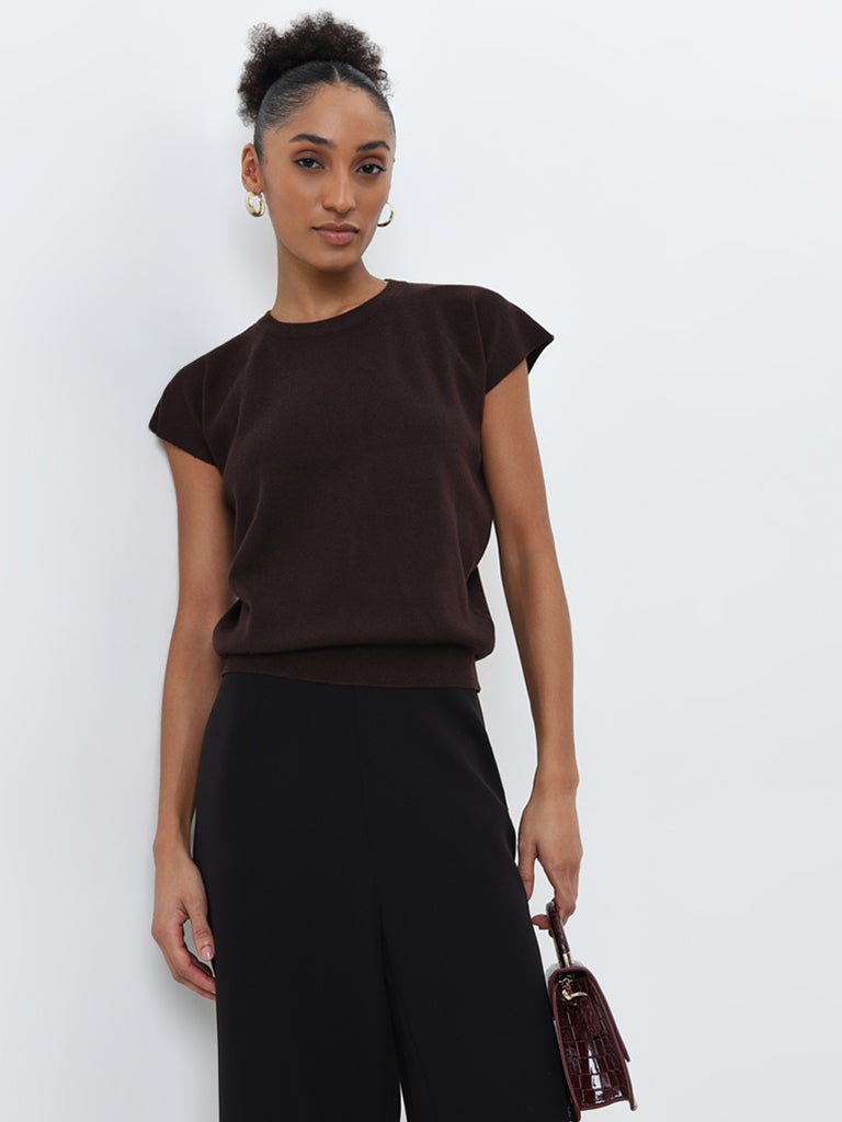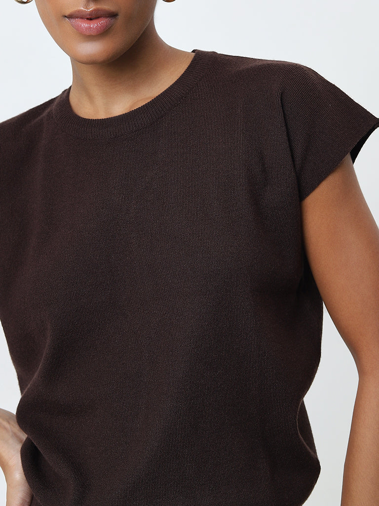 Wardrobe unveils this solid brown sweater crafted with soft and warm fabric. The winter wear features ribbed round neckline and dolman sleeves.