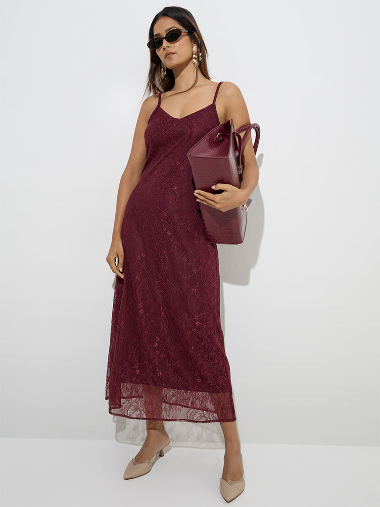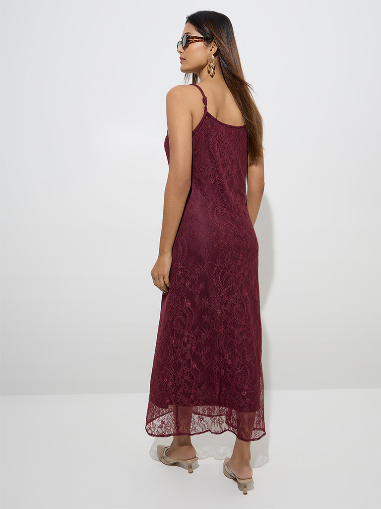 Wardrobe Burgundy Floral Lace Detailed Straight Dress