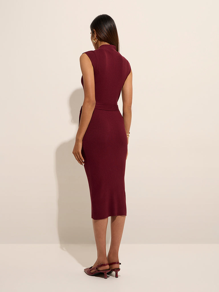 Wardrobe Burgundy Ribbed Bodycon Dress with Belt