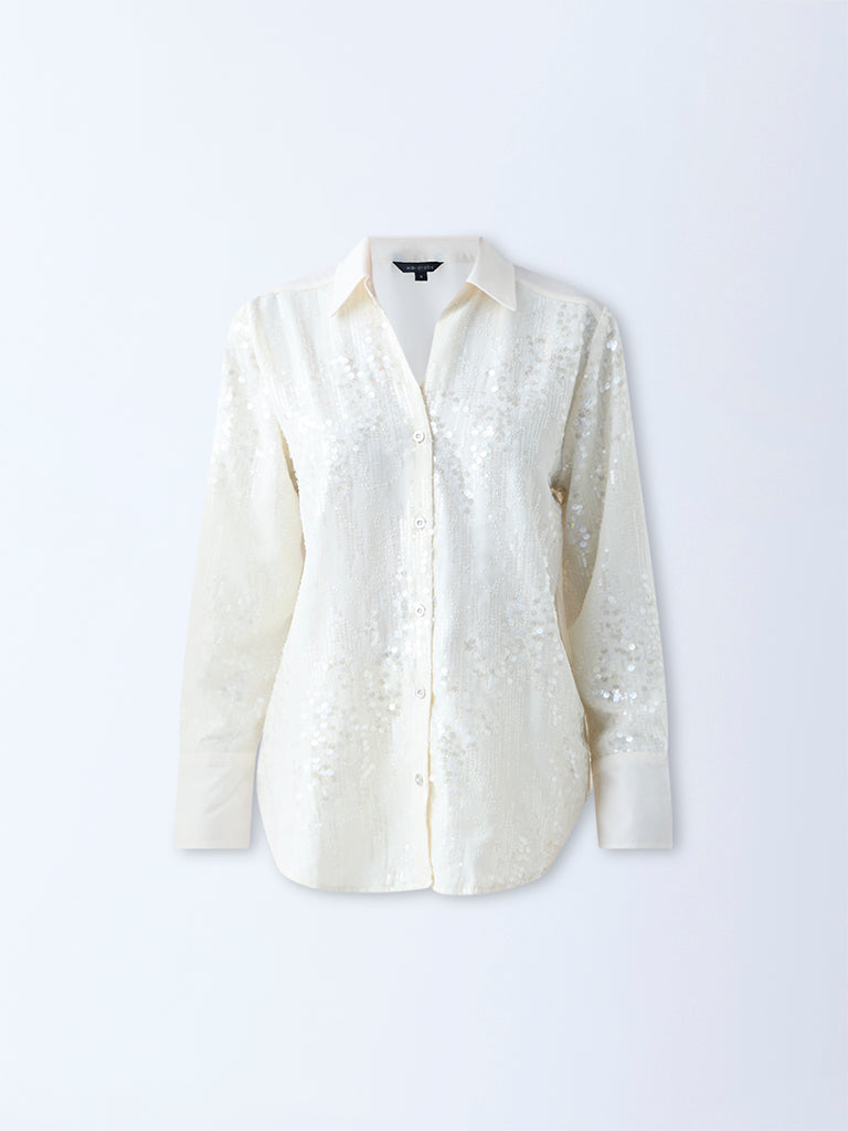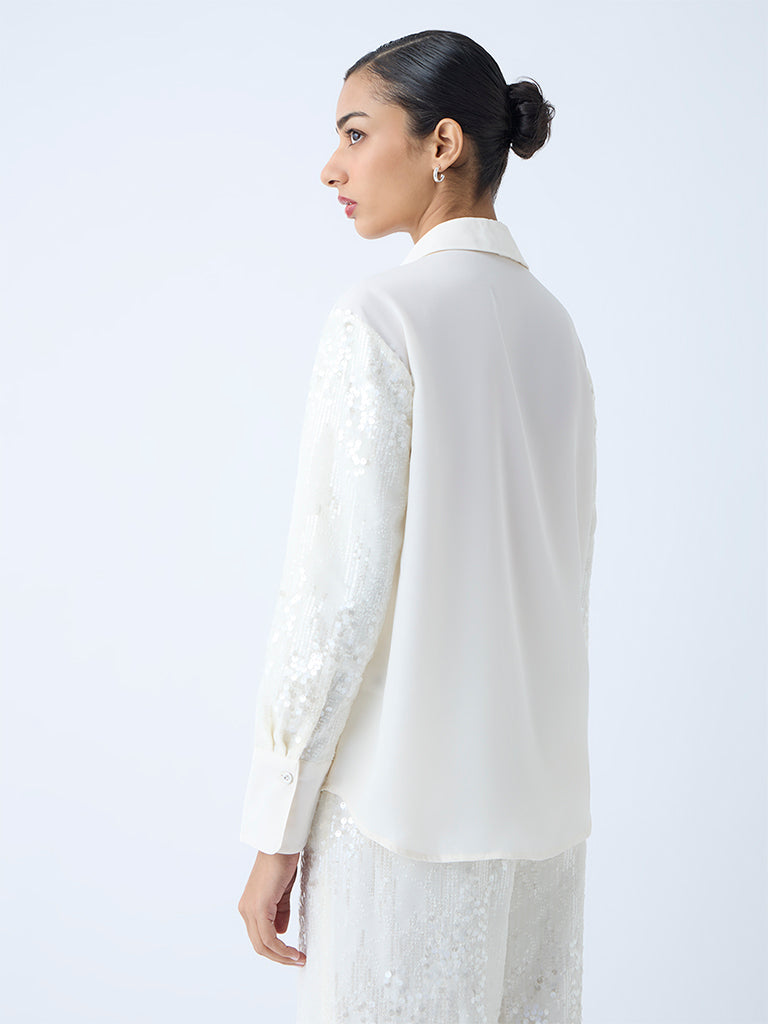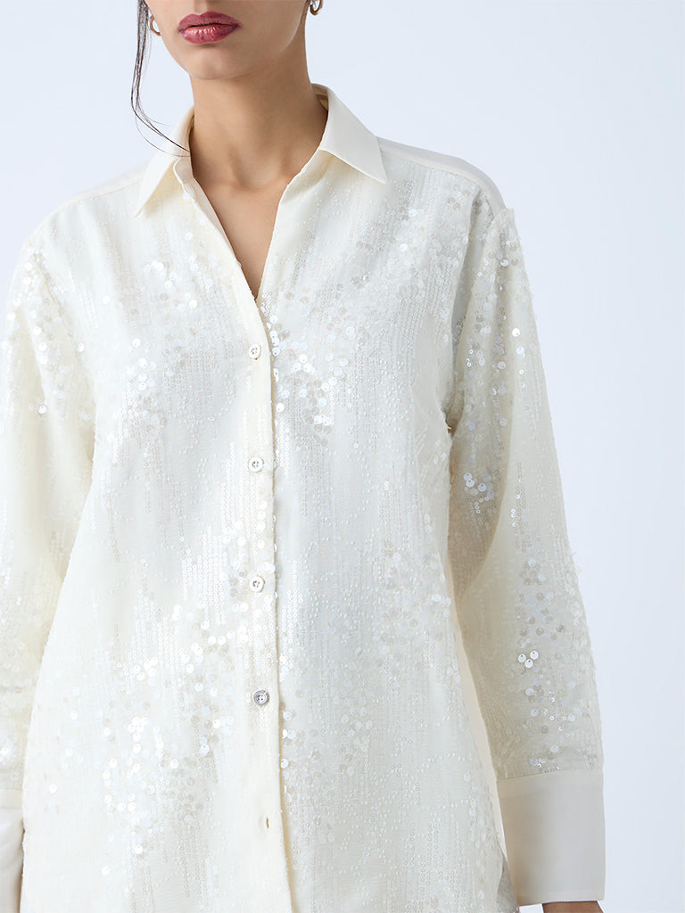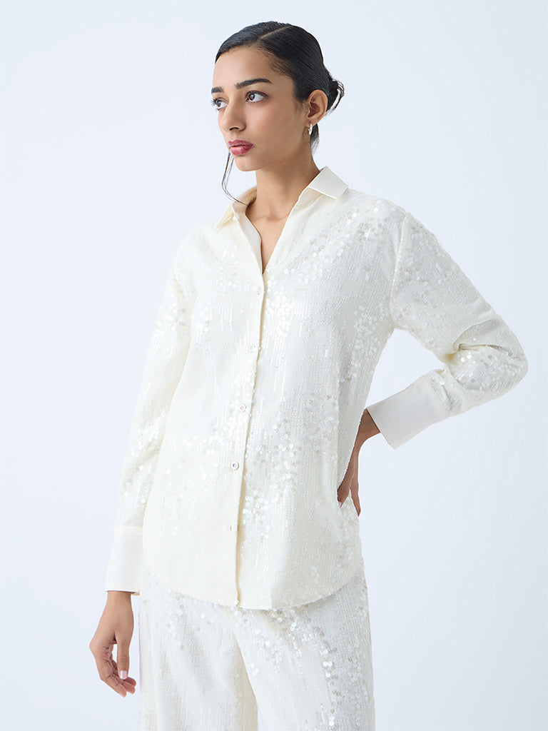 This cream shirt from Wardrobe captures quiet glamour in motion. Detailed with fine sequin work. a smart collar. and full sleeves. it blends classic tailoring with understated sparkle.