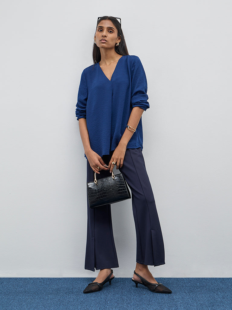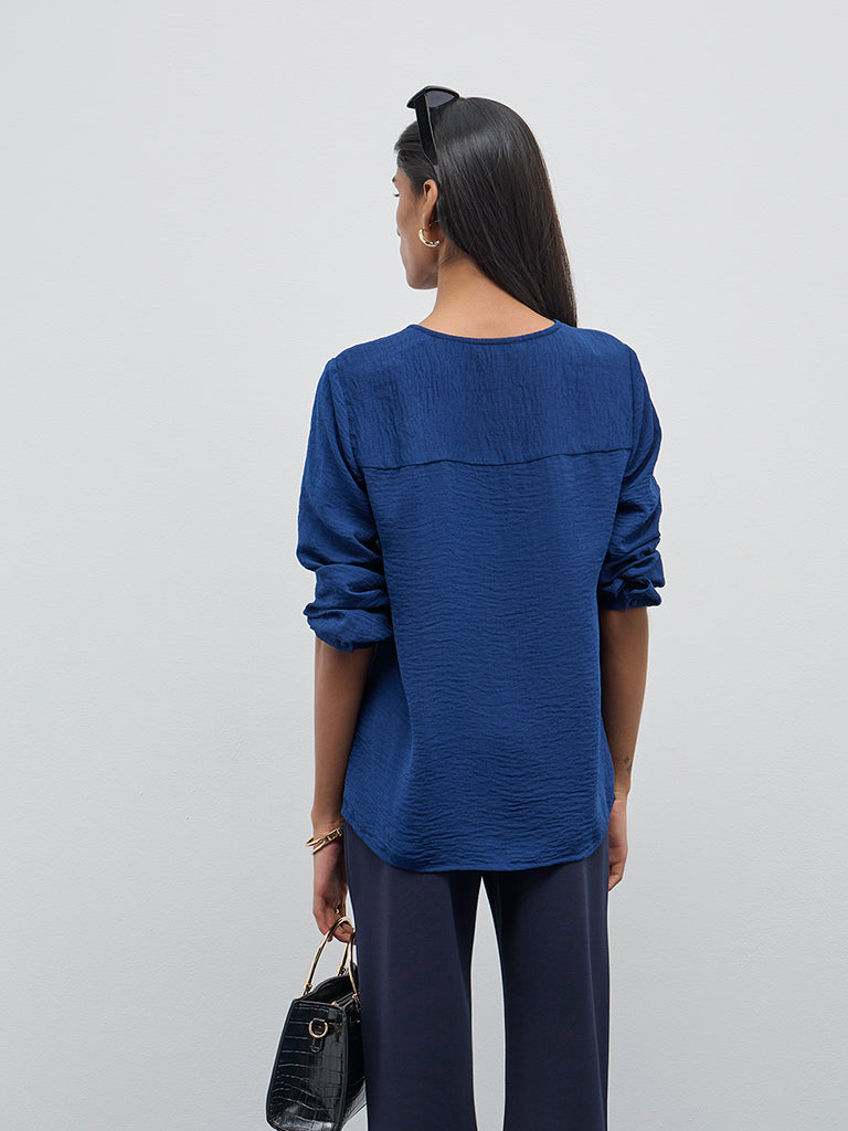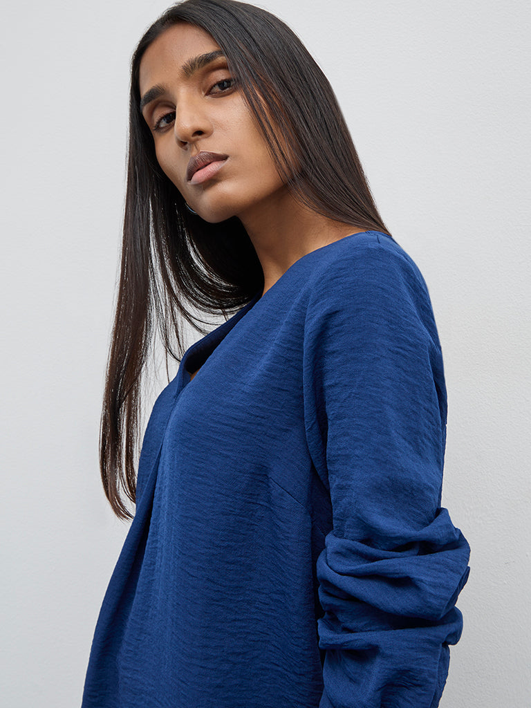 This dark blue top from Wardrobe is woven from a crinkle-textured fabric with a V-neck and full sleeves.