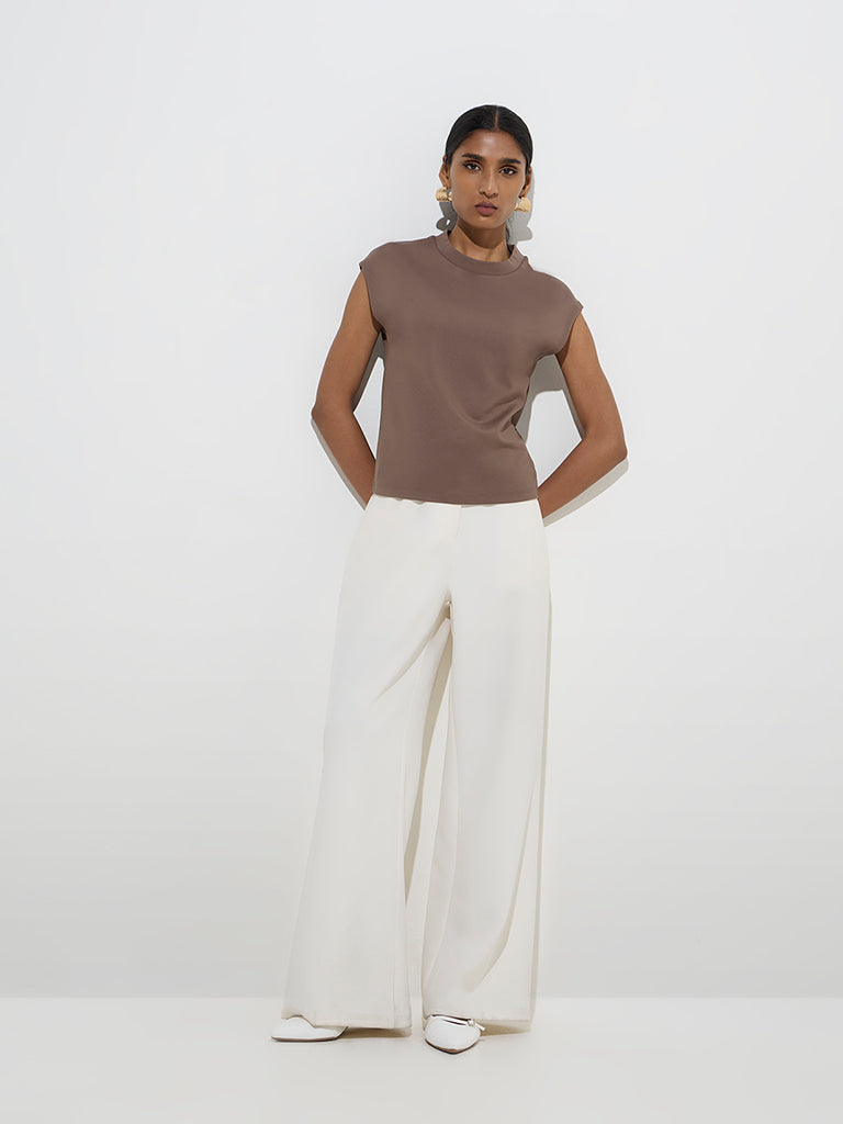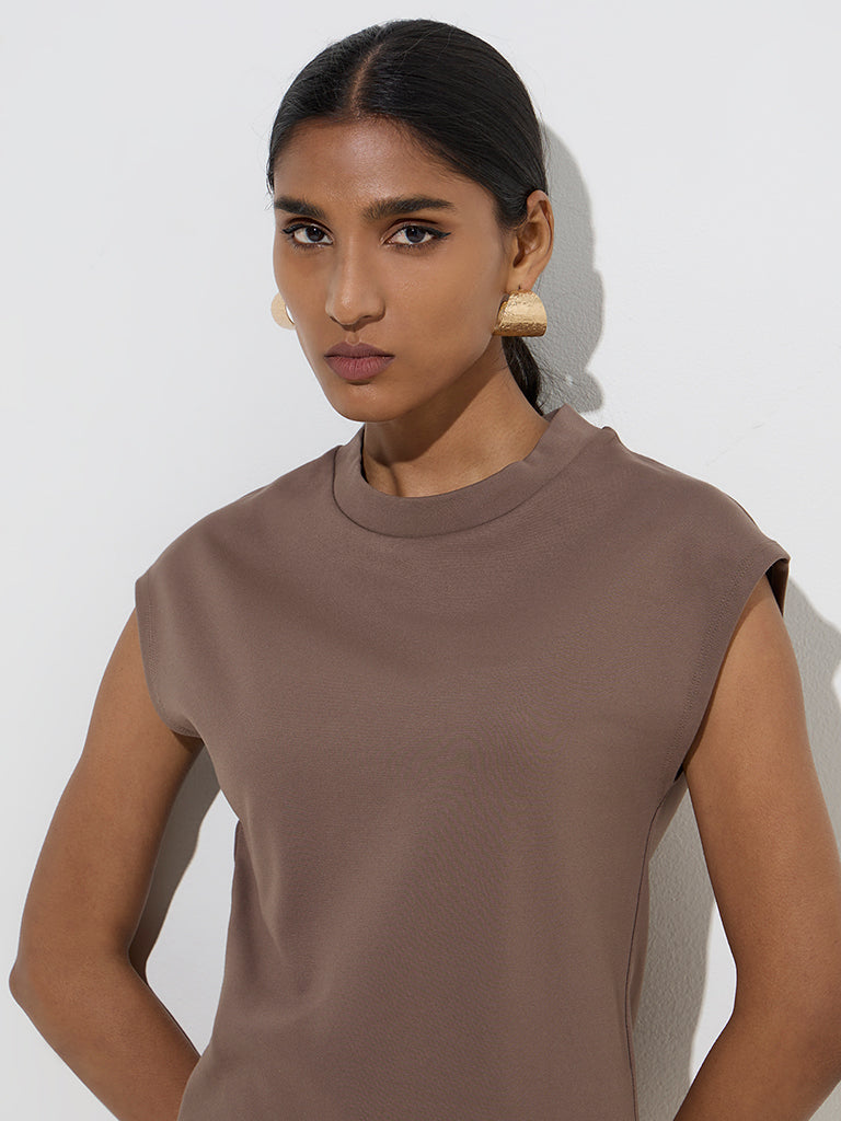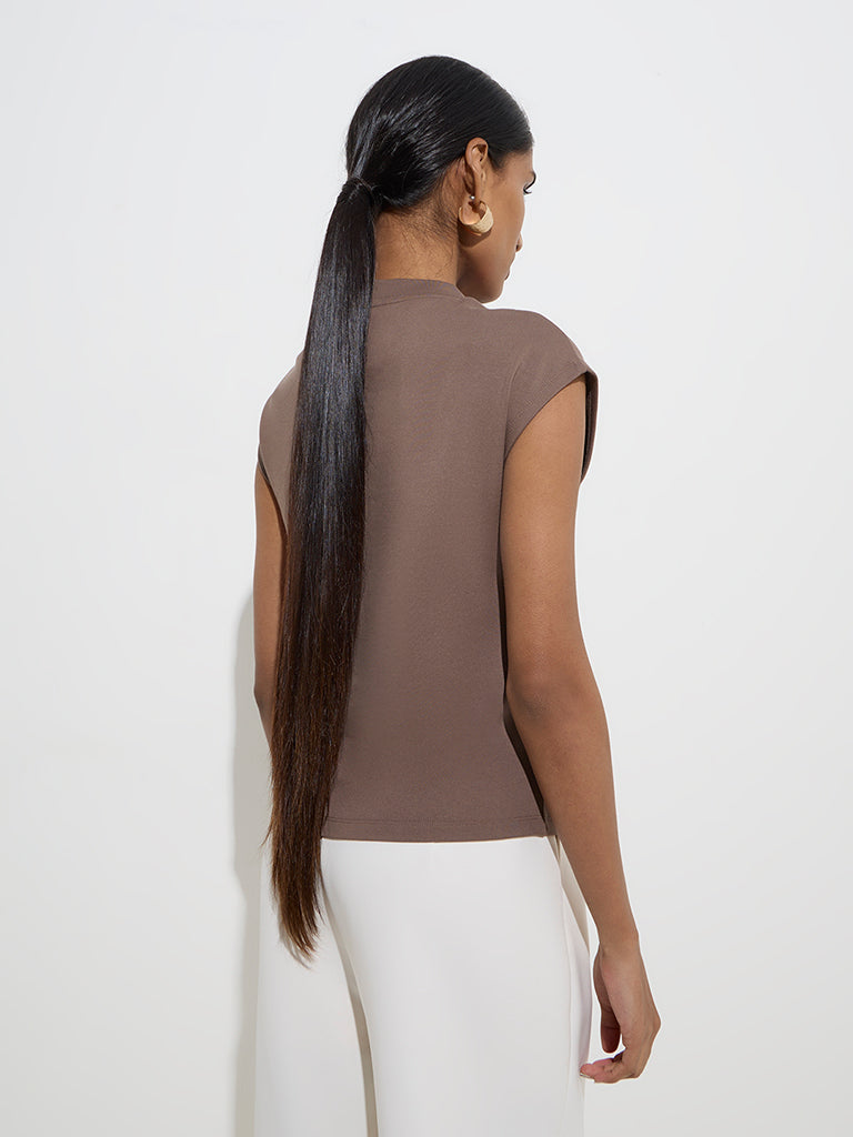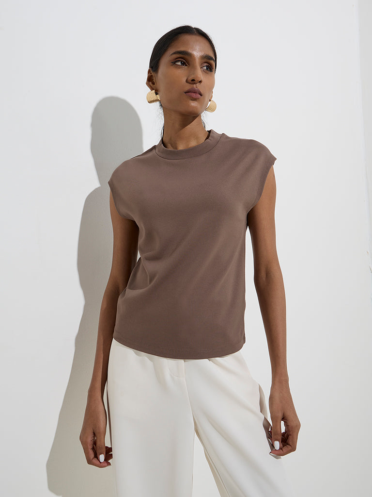 This dark brown top from Wardrobe channels understated sophistication with its minimalistic design. Crafted for a refined yet effortless look. it features a chic round neck and relaxed dolman sleeves.