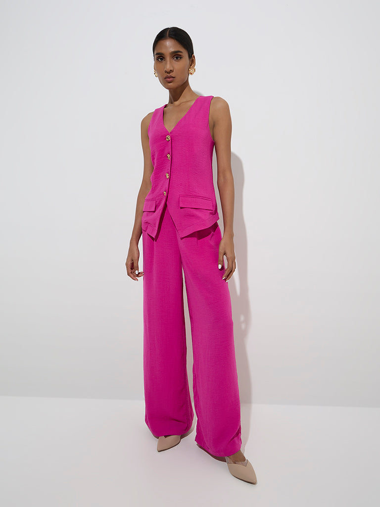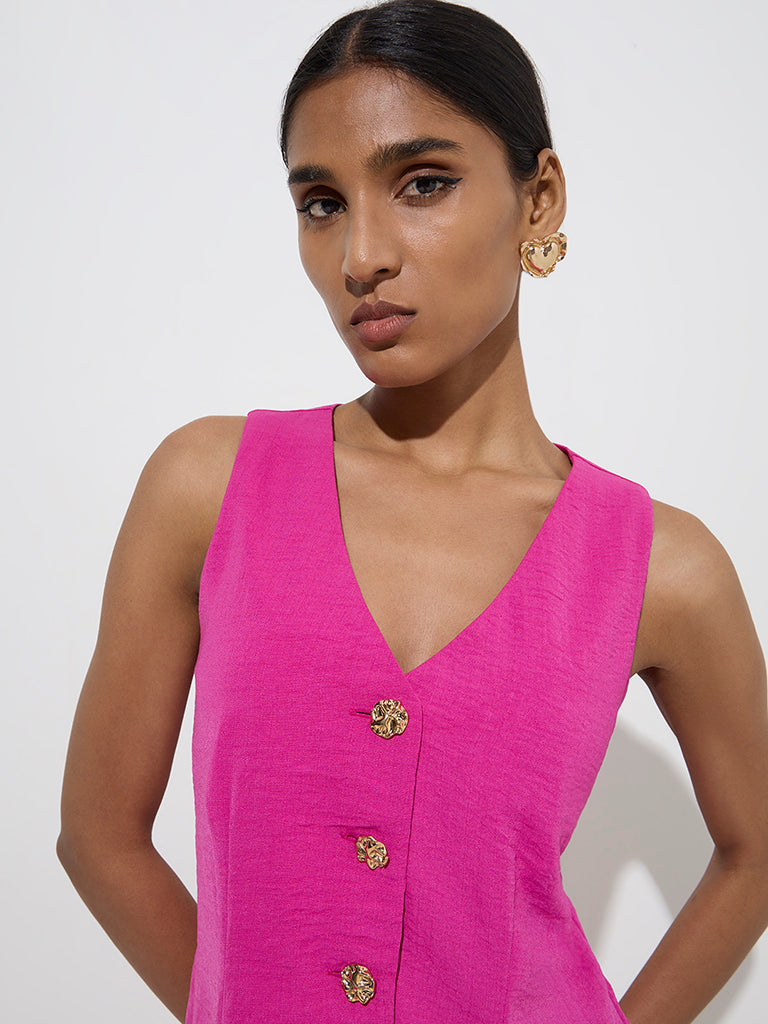 This fuchsia waistcoat-style top from Wardrobe is designed with a flattering V-neck and sleeveless cut. accented with an embellished button placket for a refined touch. Its breathable composition ensures all-day comfort. while the crinkle texture adds a stylish finish.