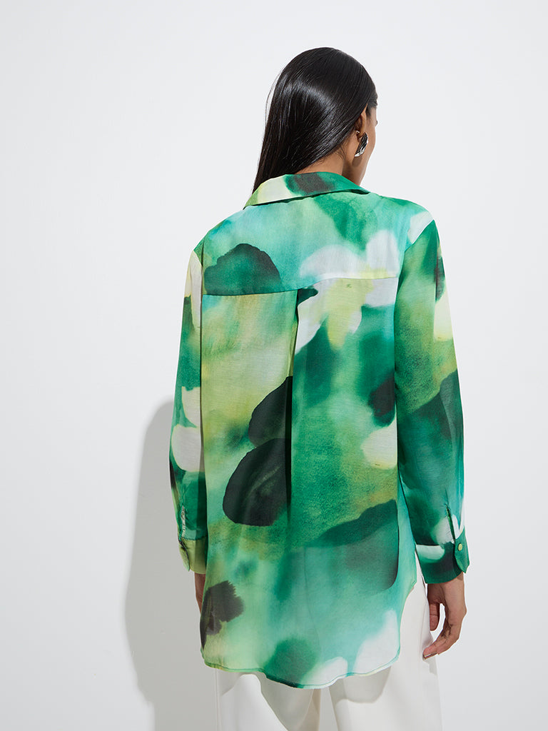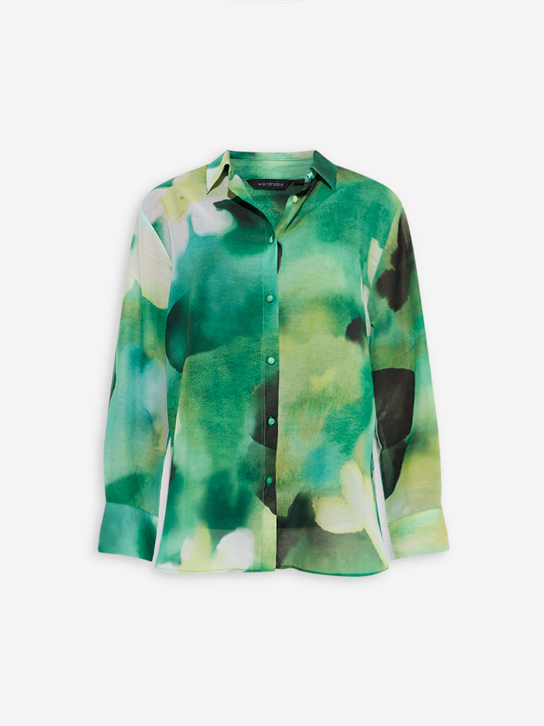 This green shirt from Wardrobe is adorned with vivid abstract patterns that bring a bold yet refined flair to everyday dressing. Crafted from premium-quality fabric for all-day comfort. it features a semi-spread collar. a button placket. and full sleeves with buttoned cuffs.