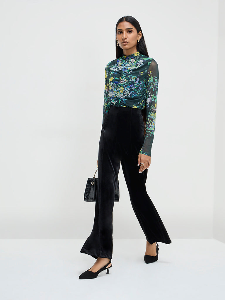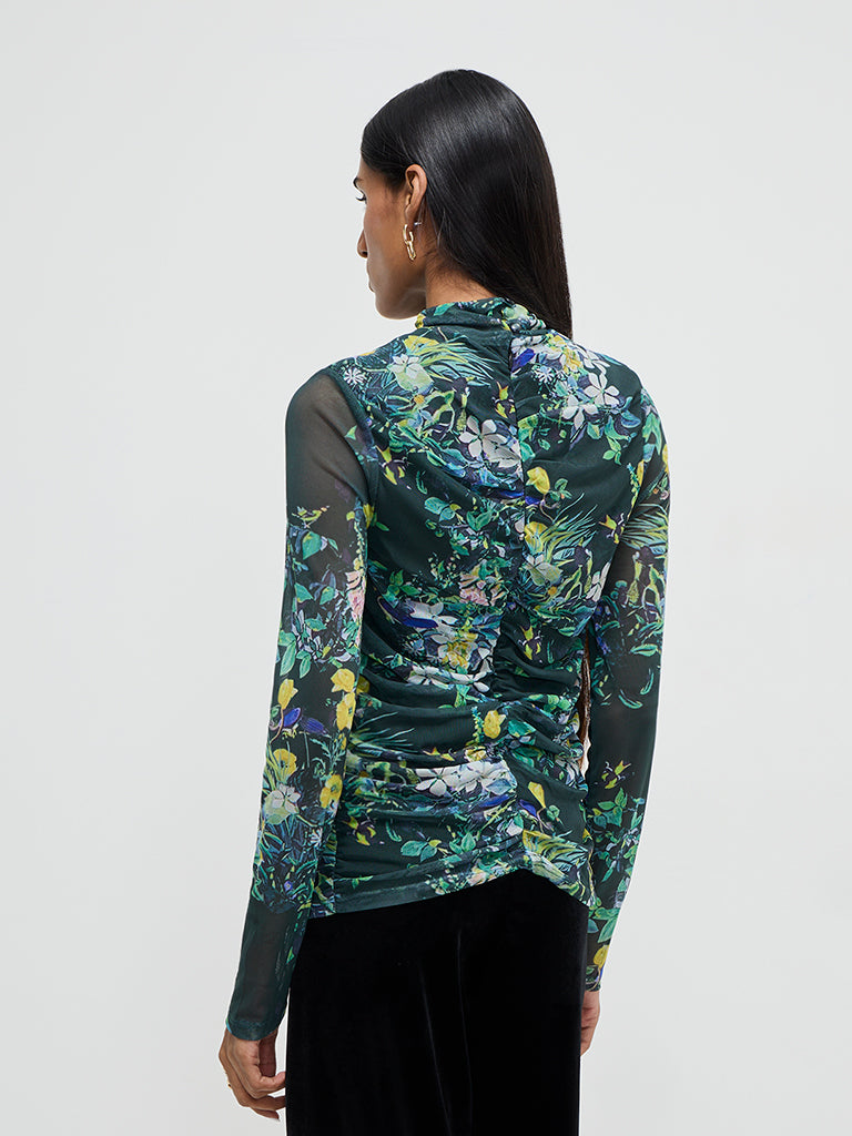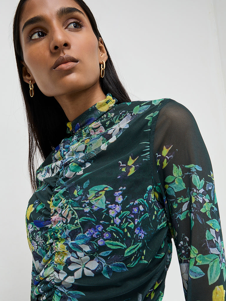 Wardrobe launches this green mesh top featuring botanical-themed print. The soft and stretchable fabric garment is fashioned with ruched detailing. It boasts a high-neck and full sleeves and is secured with a zipline at the back.