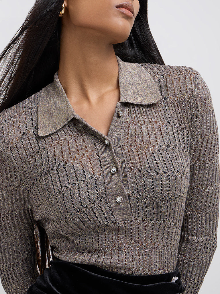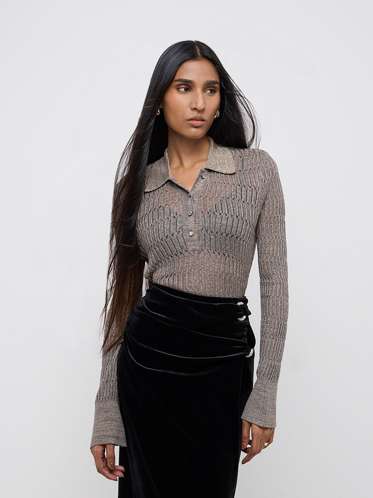 Wardrobe presents this grey sweater enhanced with delicate gold-toned thread work. Crafted from a knitted fabric. the winter wear is fitted with a spread collar leading to button down style and flared sleeves.