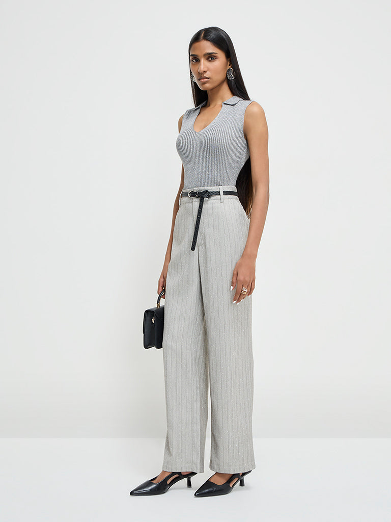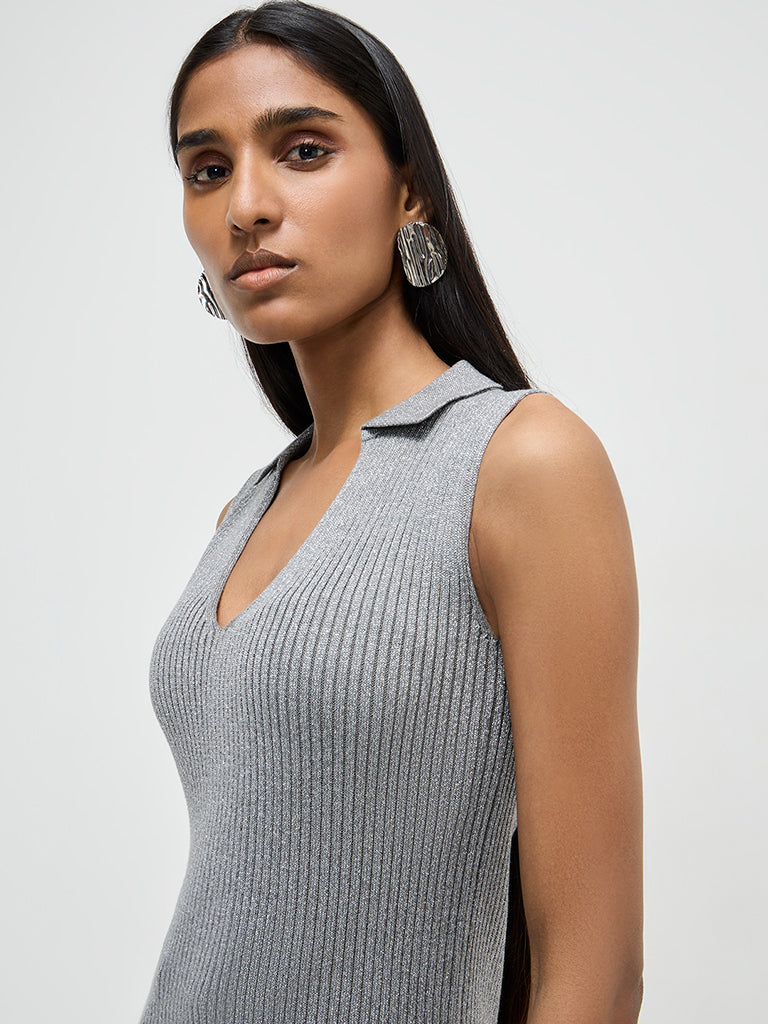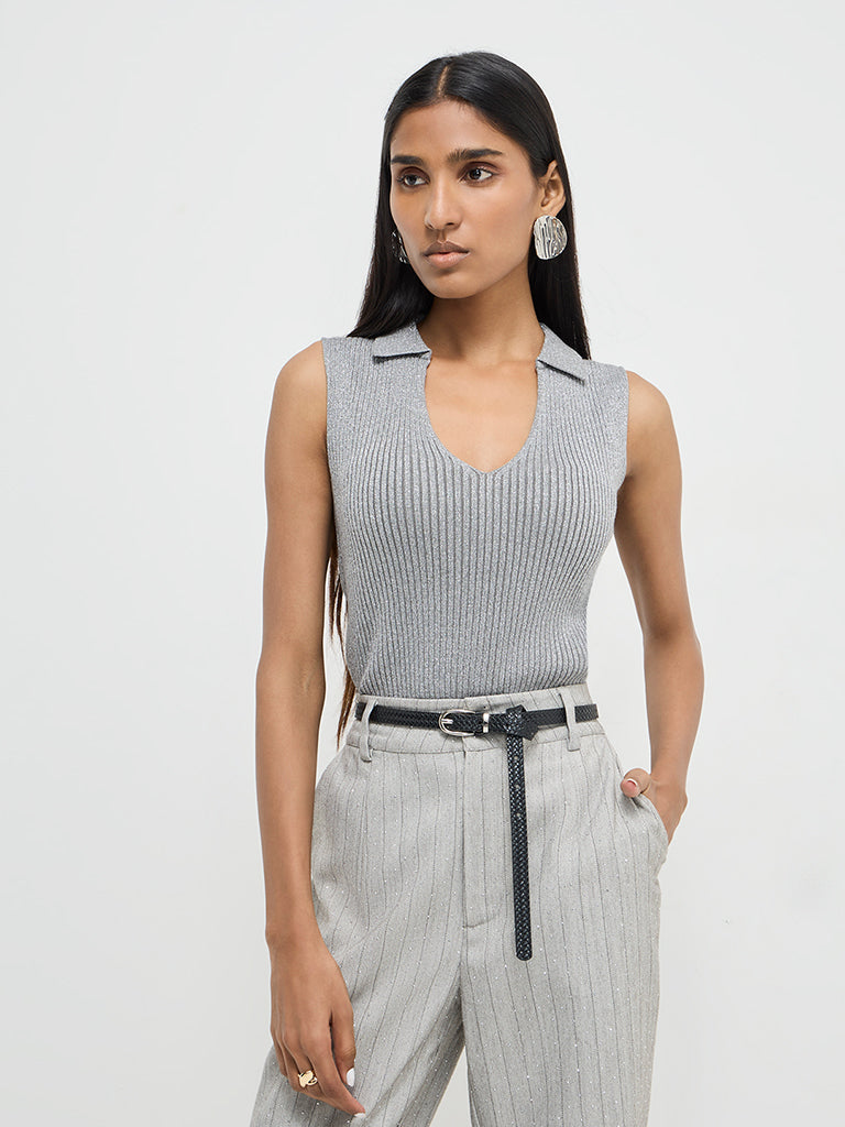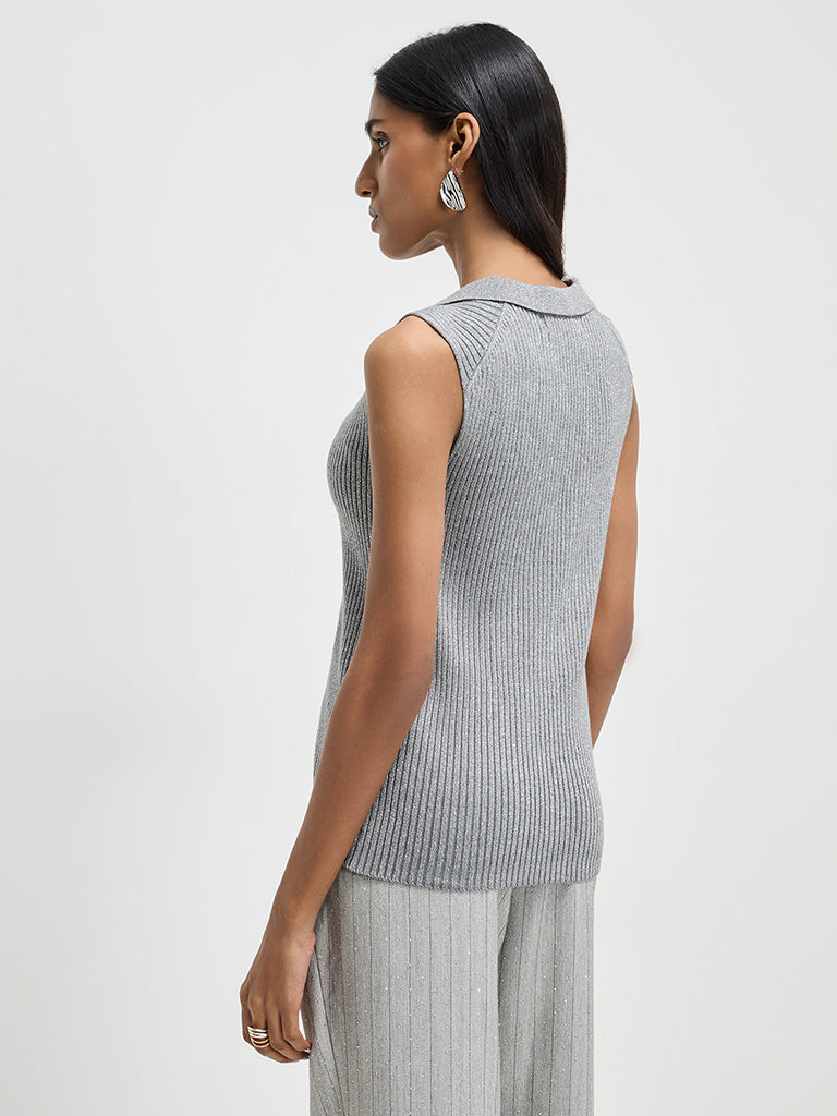 Wardrobe brings you this grey sweater in ribbed fashion. The cotton-rich garment is enhanced with intricate shimmer-detailing. It boasts a notched collar and a sleeveless cut.