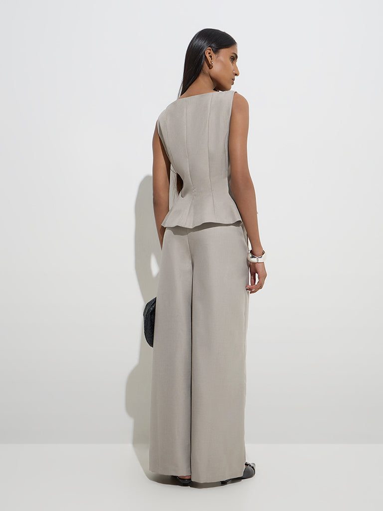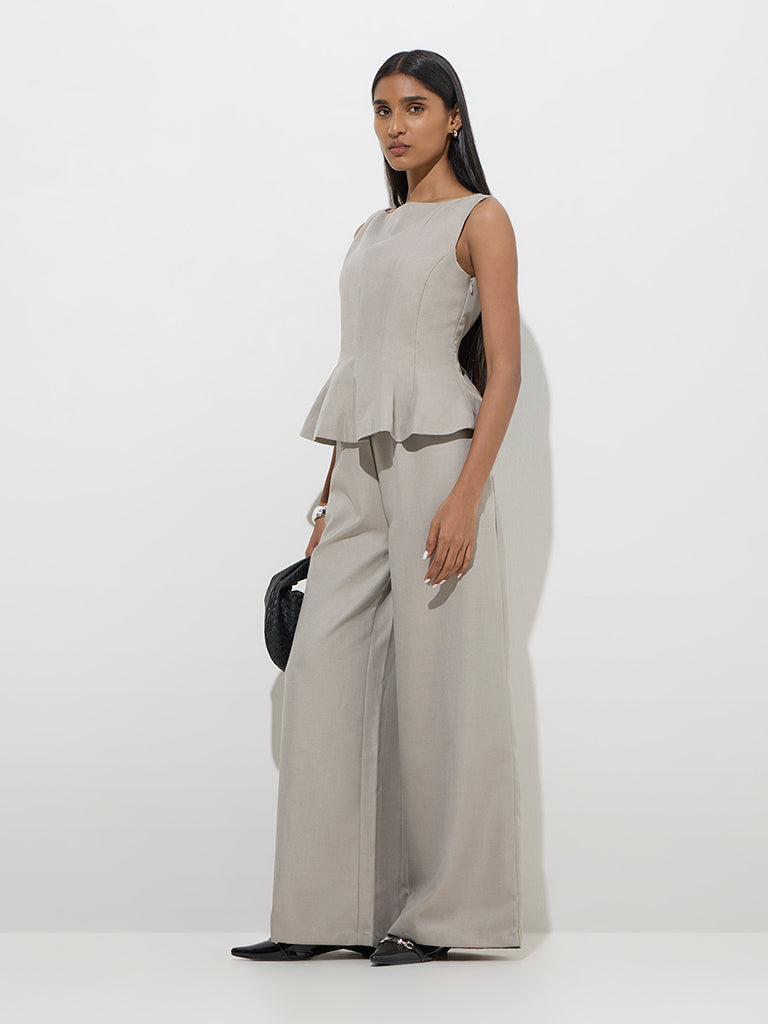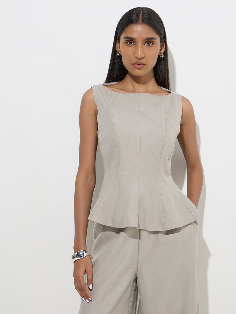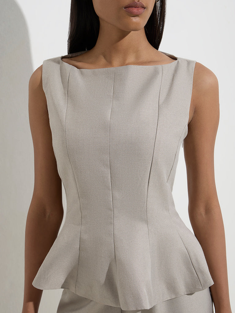 Wardrobe introduces this grey top. tailored from lightweight fabric and shaped in a flattering peplum silhouette. The boat neckline and sleeveless design lend a refined touch. while the concealed side zipper ensures a seamless fit.