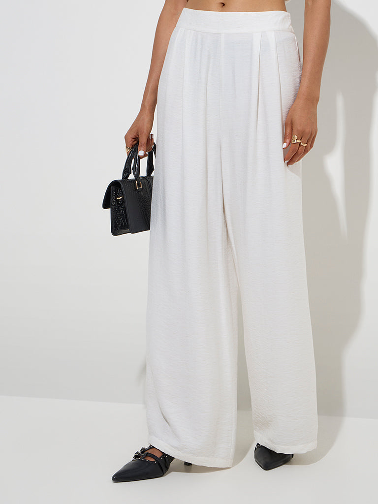 Wardrobe Ivory Crinkle-Textured Flared Mid-Rise Pants