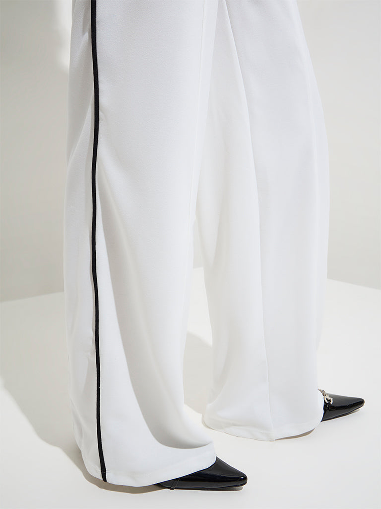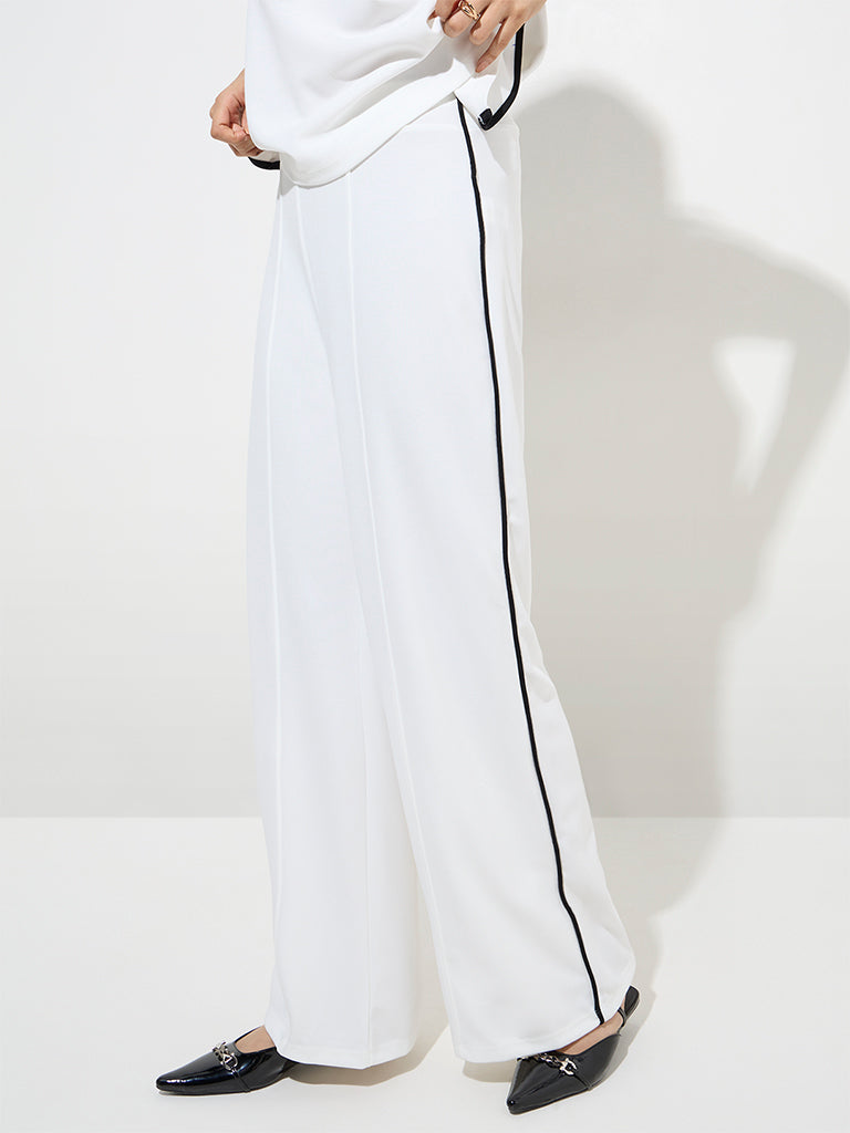 Wardrobe introduces this ivory trousers with contrast stripes on the sides. Built from a lightweight fabric. this high-rise bottom ensures a comfortable feel while adding a polished touch to casual ensembles.