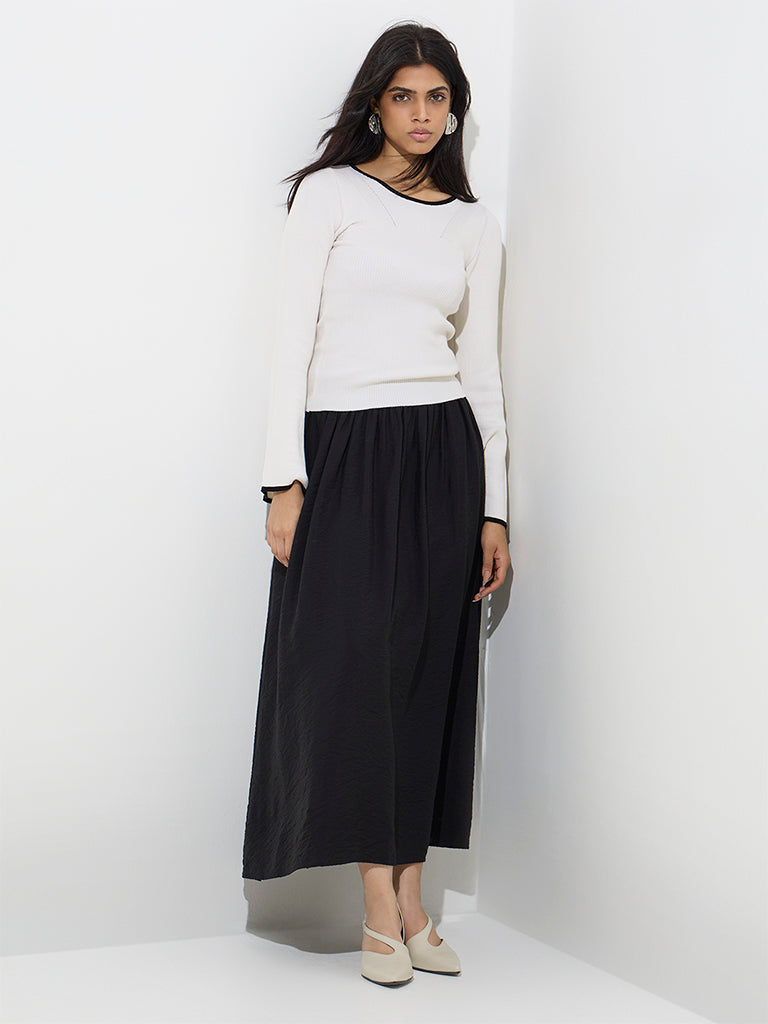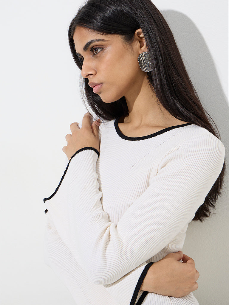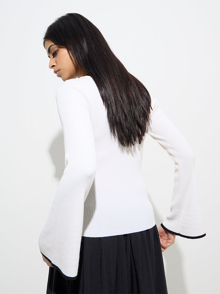 Wardrobe launches this ivory top built in a ribbed profile. crafted from an ultra-lightweight fabric for lasting comfort. Featuring a round neck and bell sleeves. it offers a contoured fit that makes it a chic choice for casual outings.