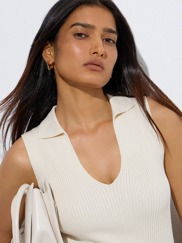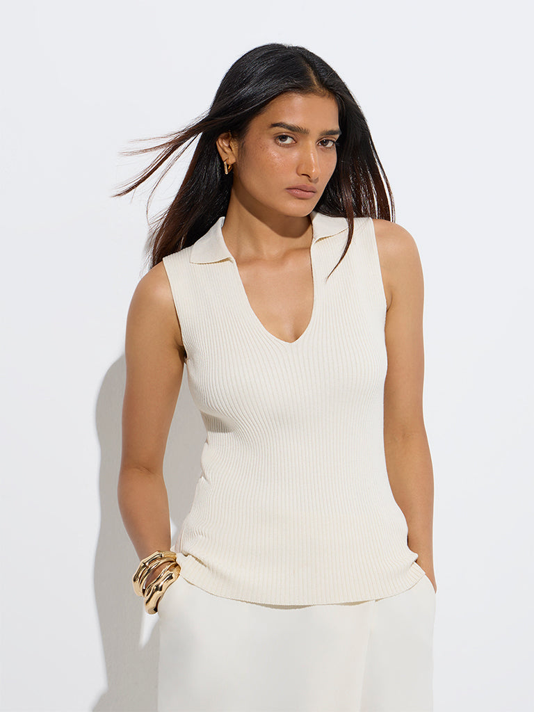 This ivory top from Wardrobe is spun from a lightweight fabric with a ribbed texture for a refined feel. Designed with a flattering V-neck collar and a sleeveless cut. it offers a sleek silhouette that’s perfect for layering or wearing solo.