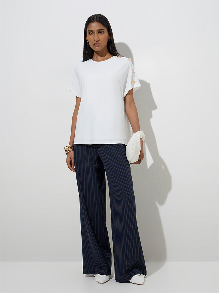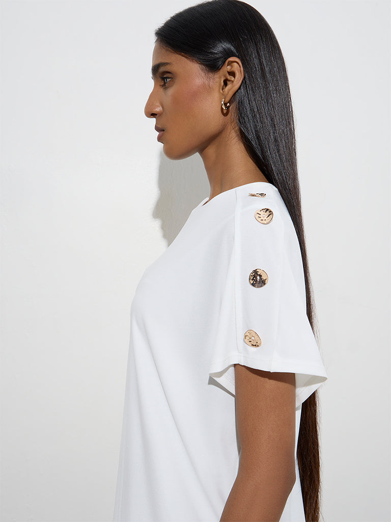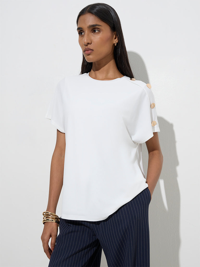 This ivory top from Wardrobe is tailored from a breathable fabric for effortless wear. Featuring a round neck and easy-flowing dolman sleeves. it’s elevated with gold-toned buttons that add just the right hint of polish.