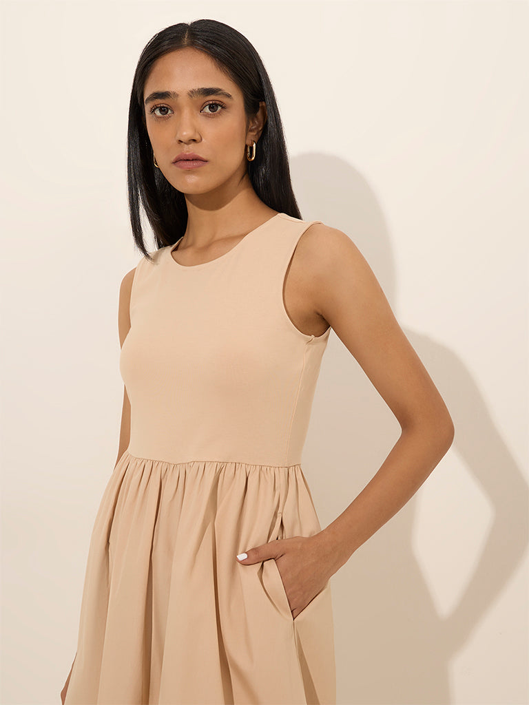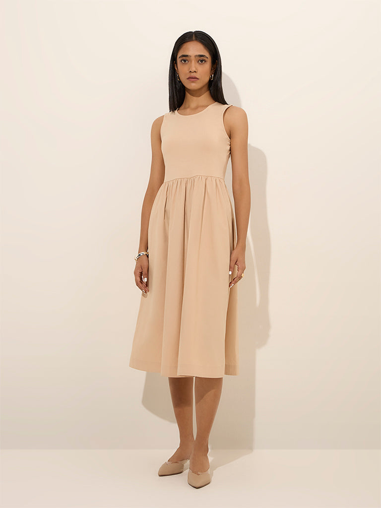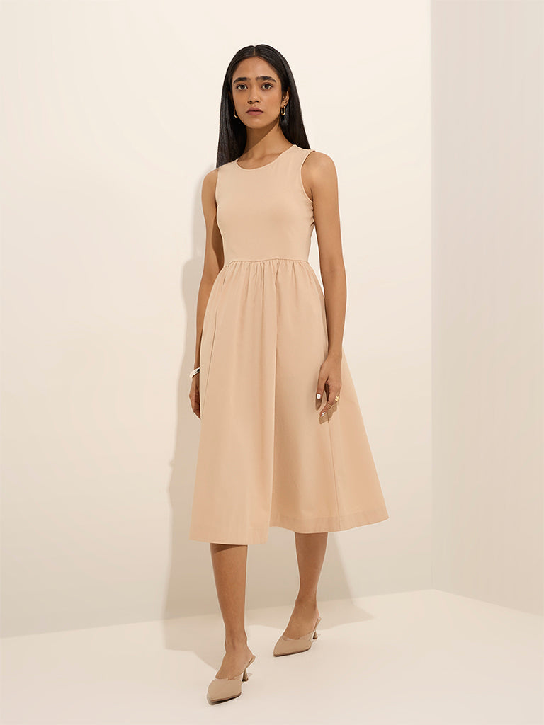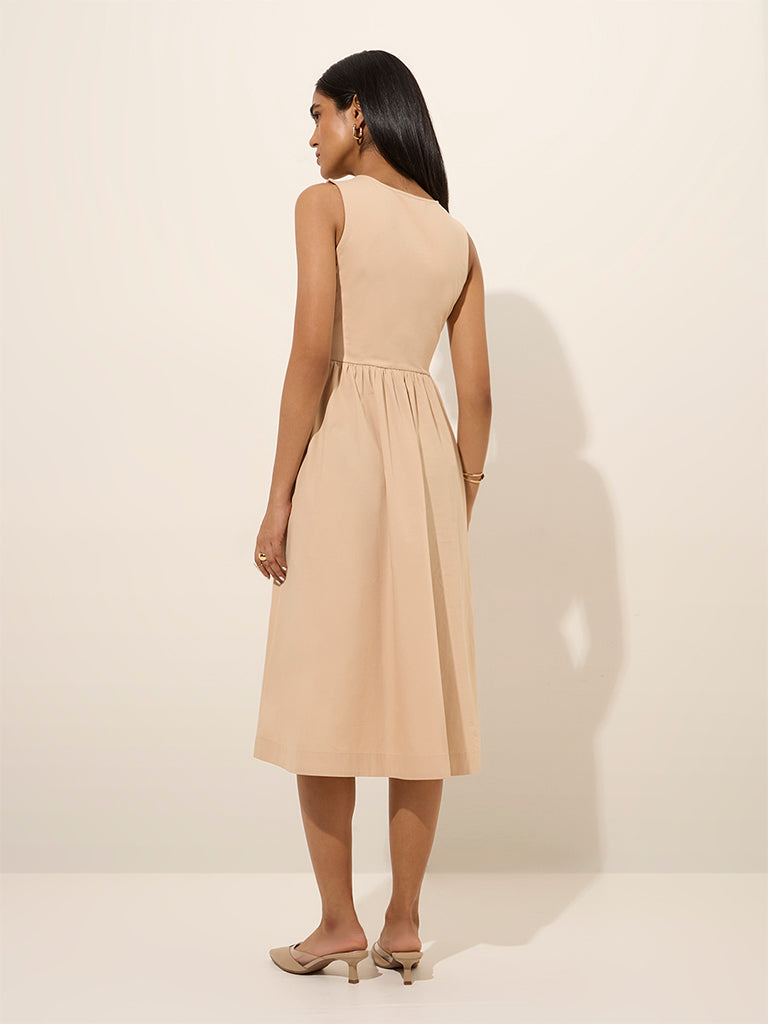 Wardrobe Light Beige Solid A-Line Cotton Dress