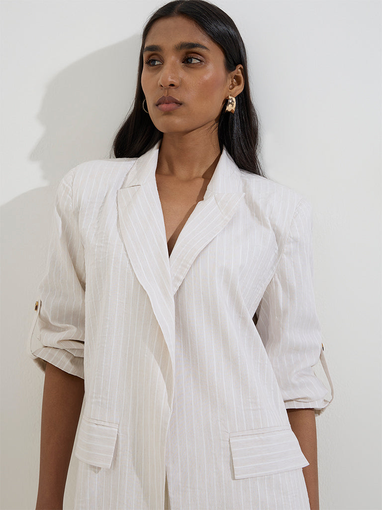 This light beige blazer from Wardrobe is milled from a lightweight fabric. making it perfect for effortless layering. Fashioned with stripe patterns. it is designed with a notched lapel. three-quarter sleeves. and two flap pockets for a chic. polished look.