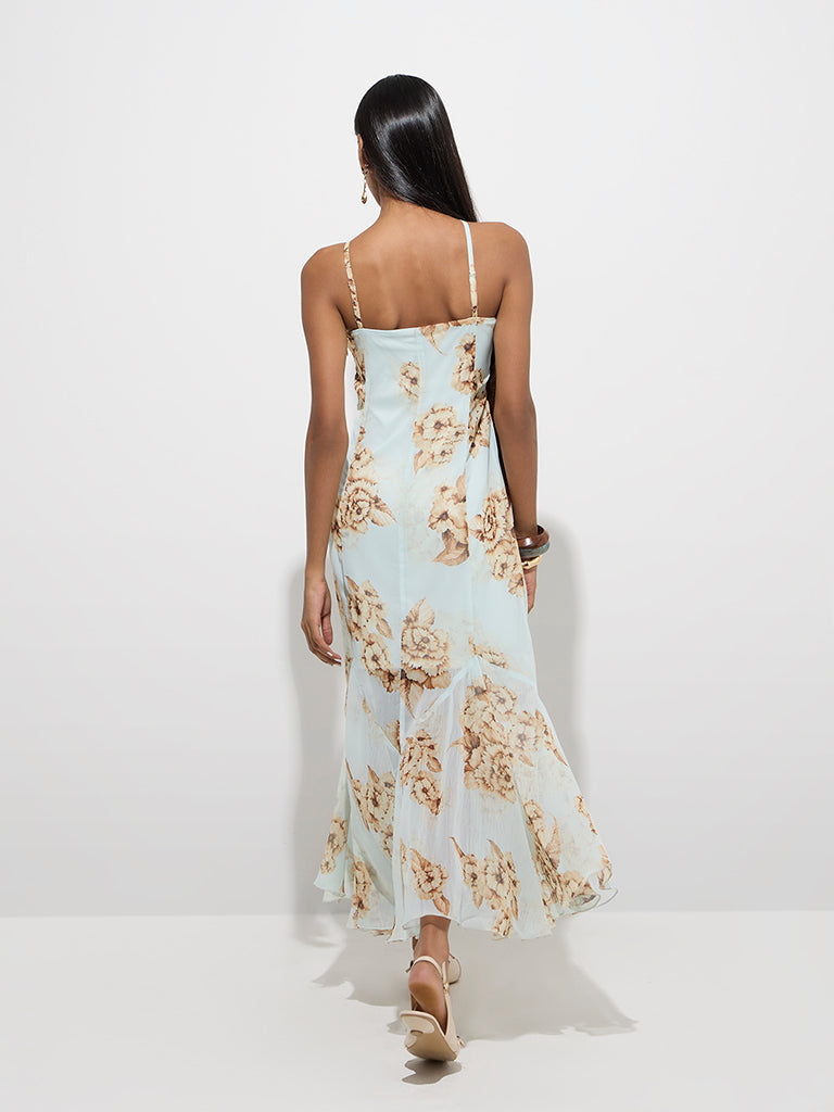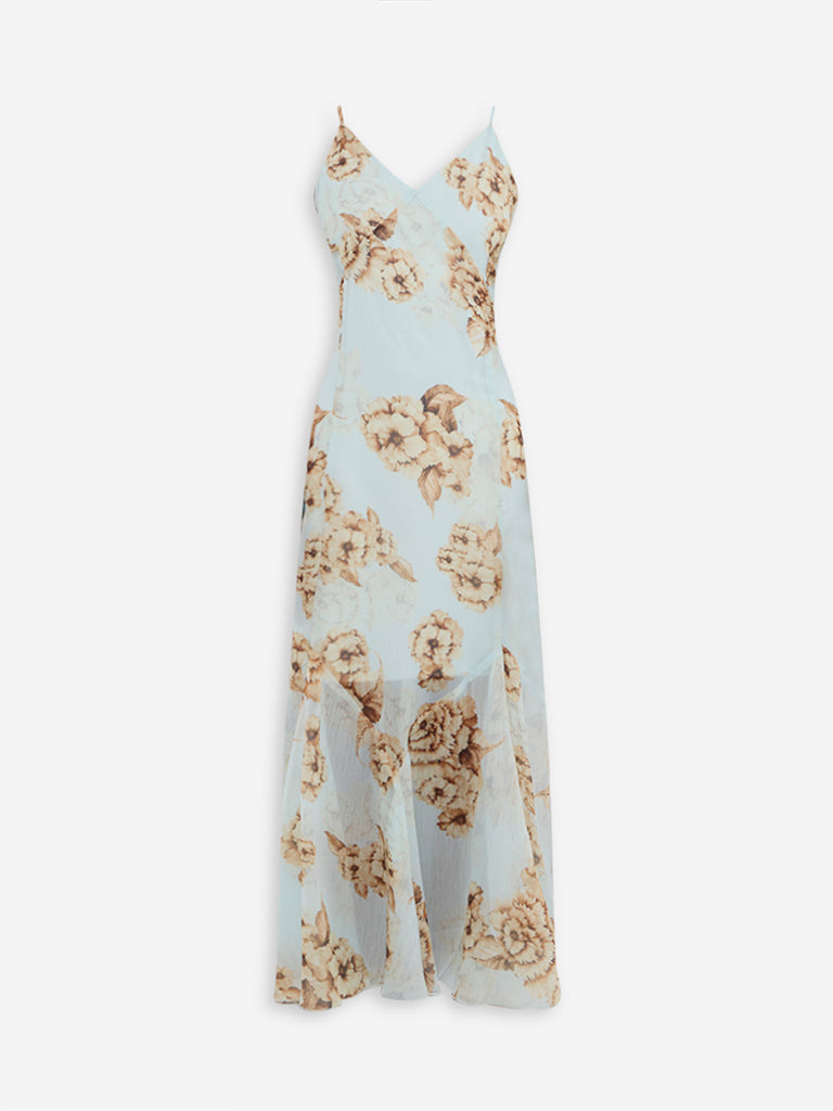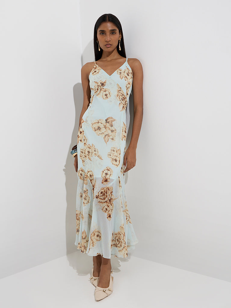 Sculpted in an A-line silhouette. this light blue dress from Wardrobe is crafted from premium-quality fabric that drapes beautifully. Adorned with exquisite floral motifs. it features a flattering V-neck and adjustable straps. making it a graceful choice for elevated daytime events or elegant evening soirées.