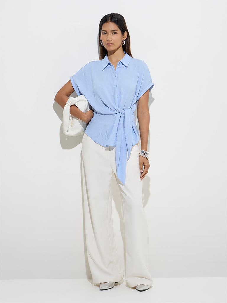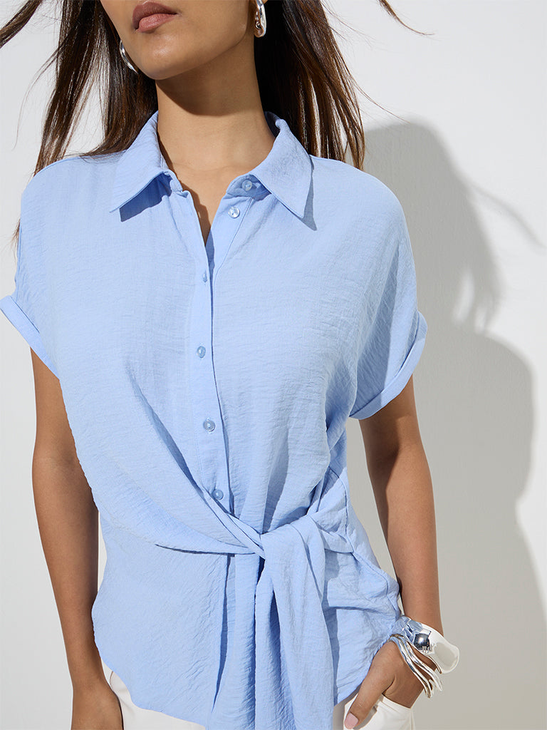 This light blue shirt from Wardrobe is crafted from a crinkle-textured fabric for a stylish. effortless appeal. Showcasing a chic knot detail at the front. it is finished with a classic collar. a button-up front. and upturned dolman sleeves for a modern touch.