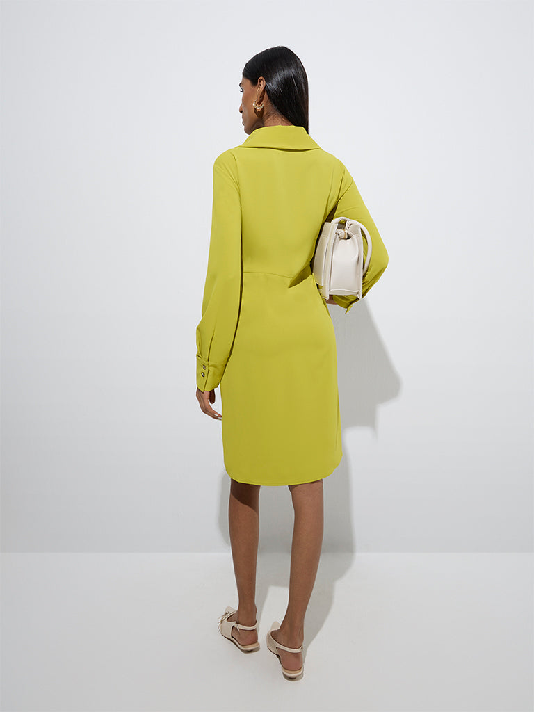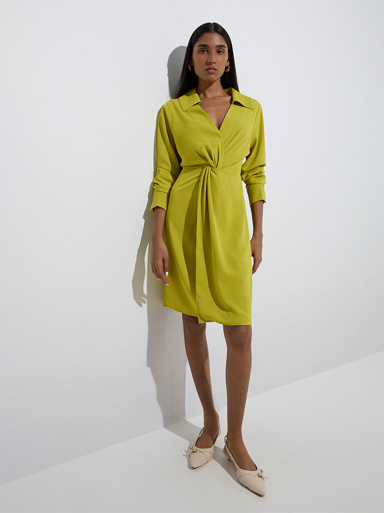 Step into sleek sophistication with this lime A-line dress from Wardrobe. a polished choice for modern formal wear. Tailored from quality fabric for a flattering fit. the solid design is elevated with subtle ruching at the waist. A V-neck collar and full sleeves complete the look with refined elegance.