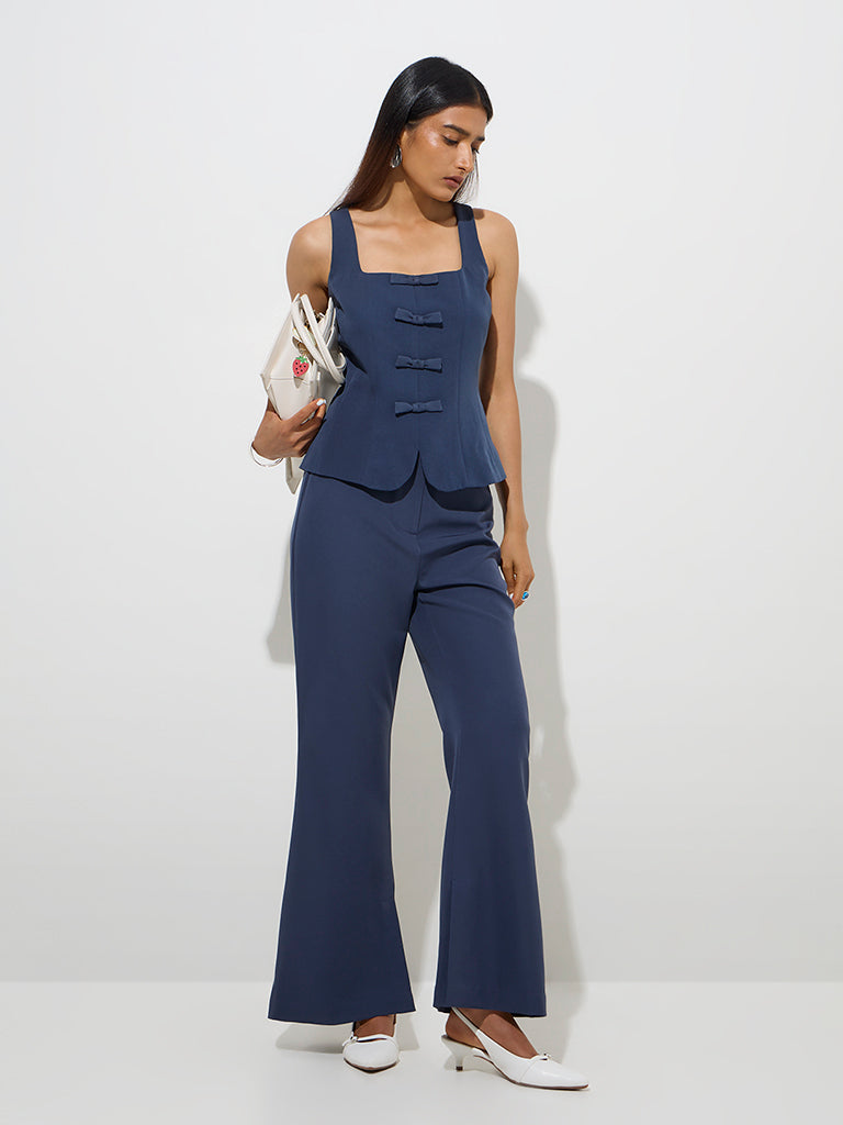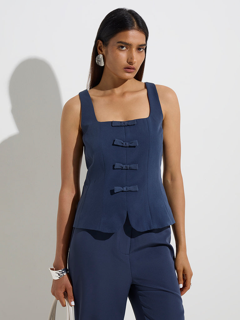 Revamp your office edit with this navy top from Wardrobe. Made from quality fabric. it features a charming bow detail at the front. while the sleeveless cut and square neck lend a modern twist to its classic design.