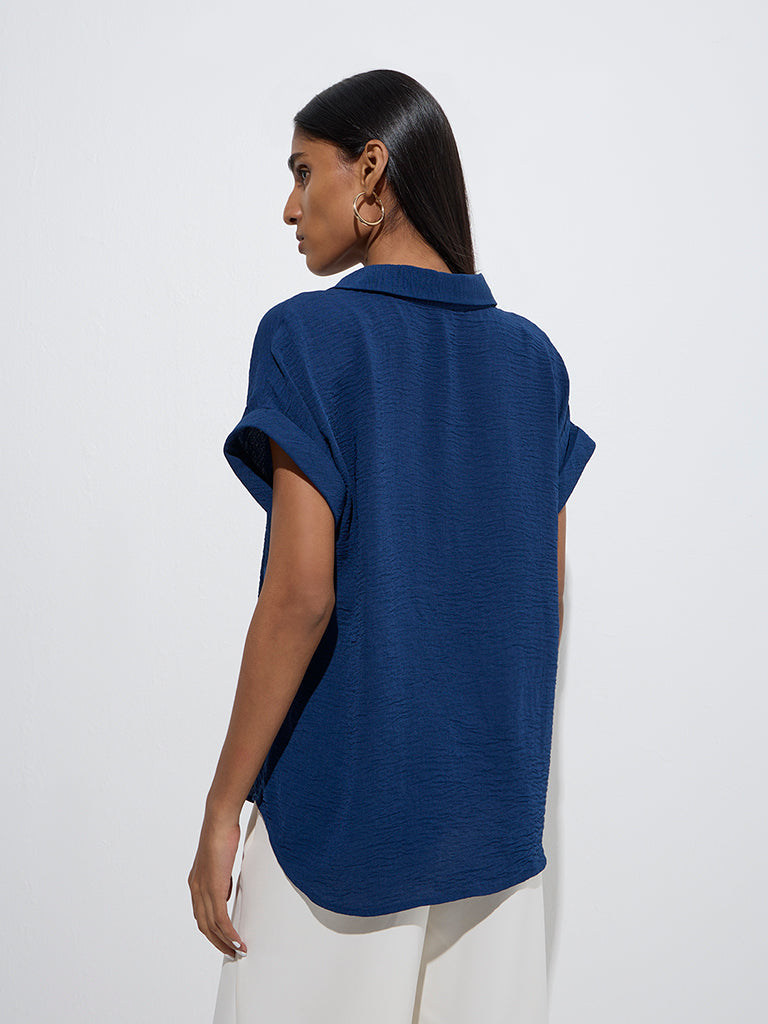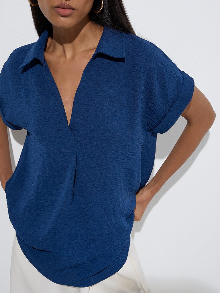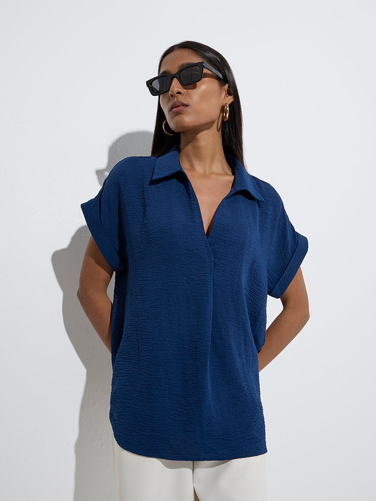 Tailored from a crinkle-textured fabric for a super-soft feel. this navy top from Wardrobe strikes the perfect balance between comfort and sophistication. It is designed with relaxed dolman sleeves and a V-neck collar for an effortlessly polished look.