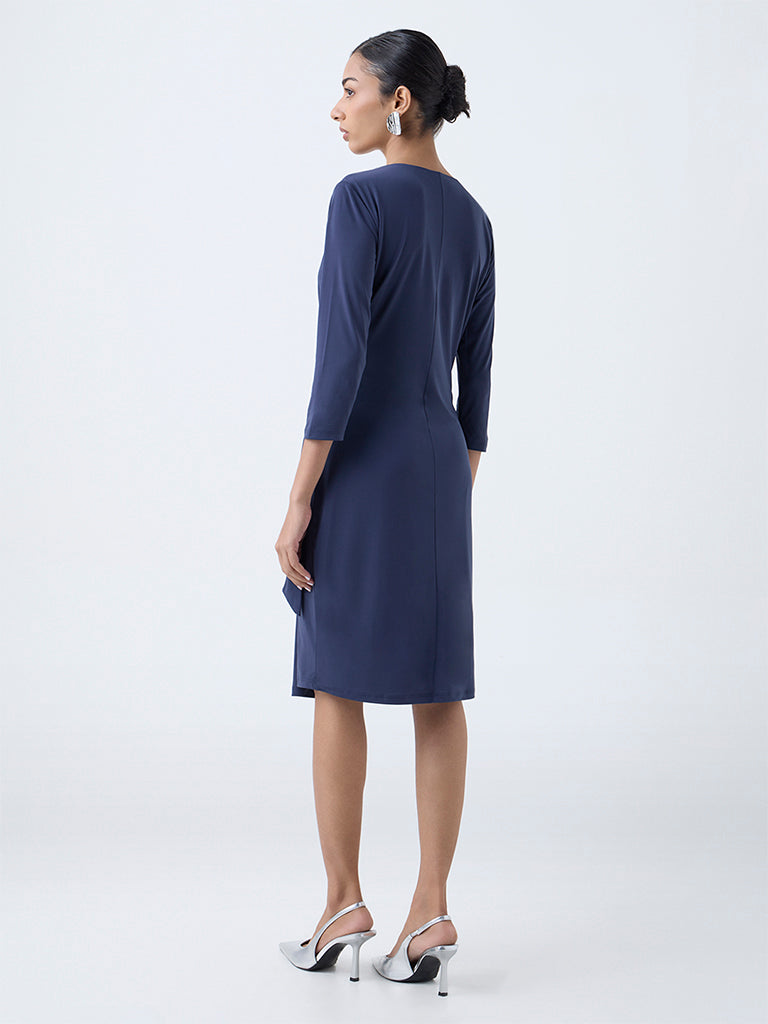 Wardrobe’s navy dress is designed for impact without overstatement. The A-line silhouette is elevated with ruched detailing along the front. gathered into a silver-toned buckle for subtle definition. A V-neck transitions into a wrap-style bodice. framed with 3/4 sleeves for balanced coverage. Crafted in premium fabric. it offers structure and comfort in equal measure.