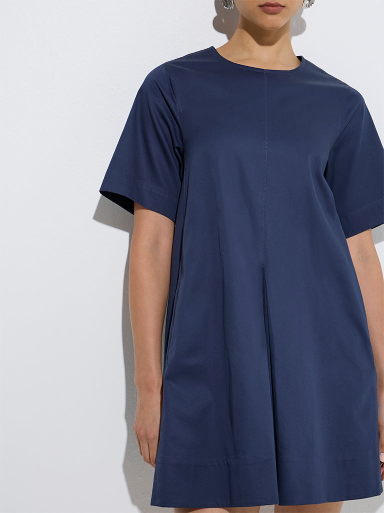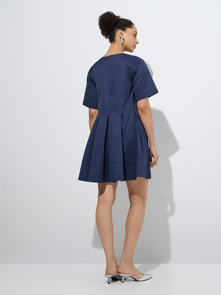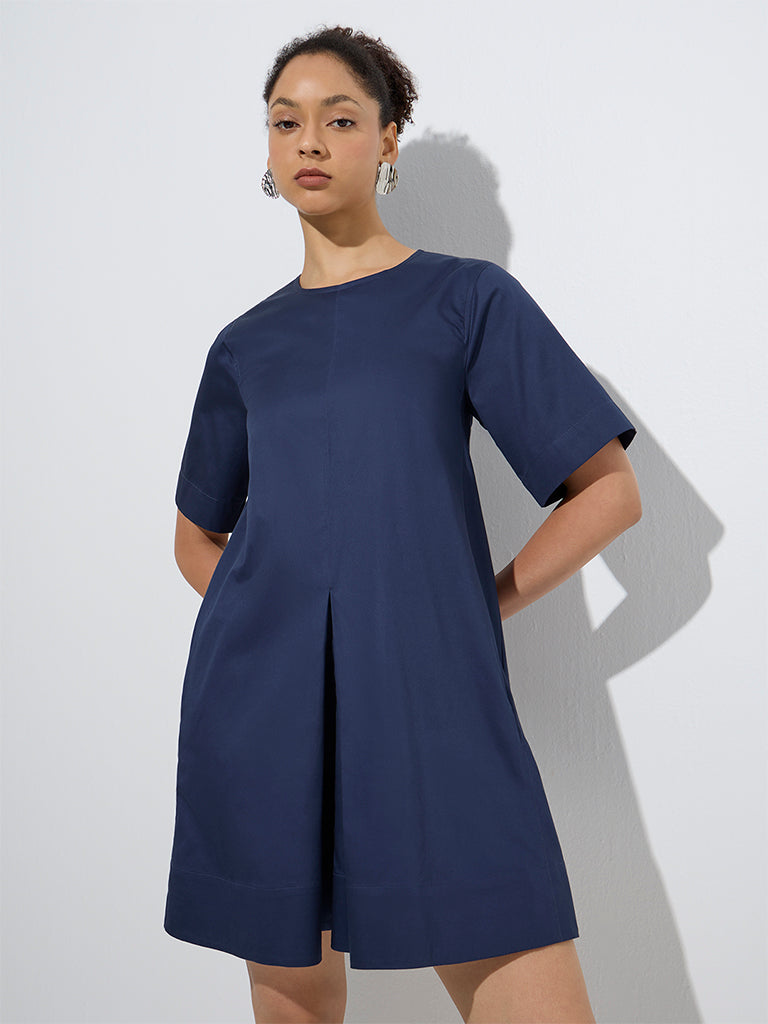 This navy dress from Wardrobe showcases a minimalistic profile. Made from pure cotton for all-day comfort. it features box pleats at the back. while the round neck and Half sleeves complete the clean. effortless look.
