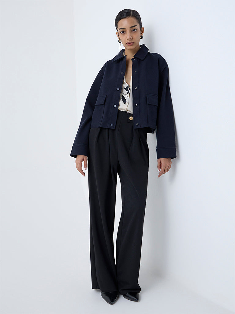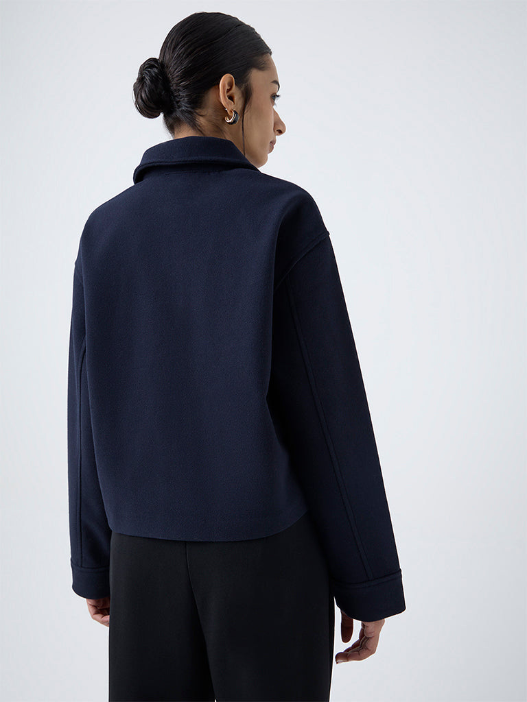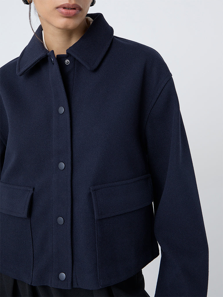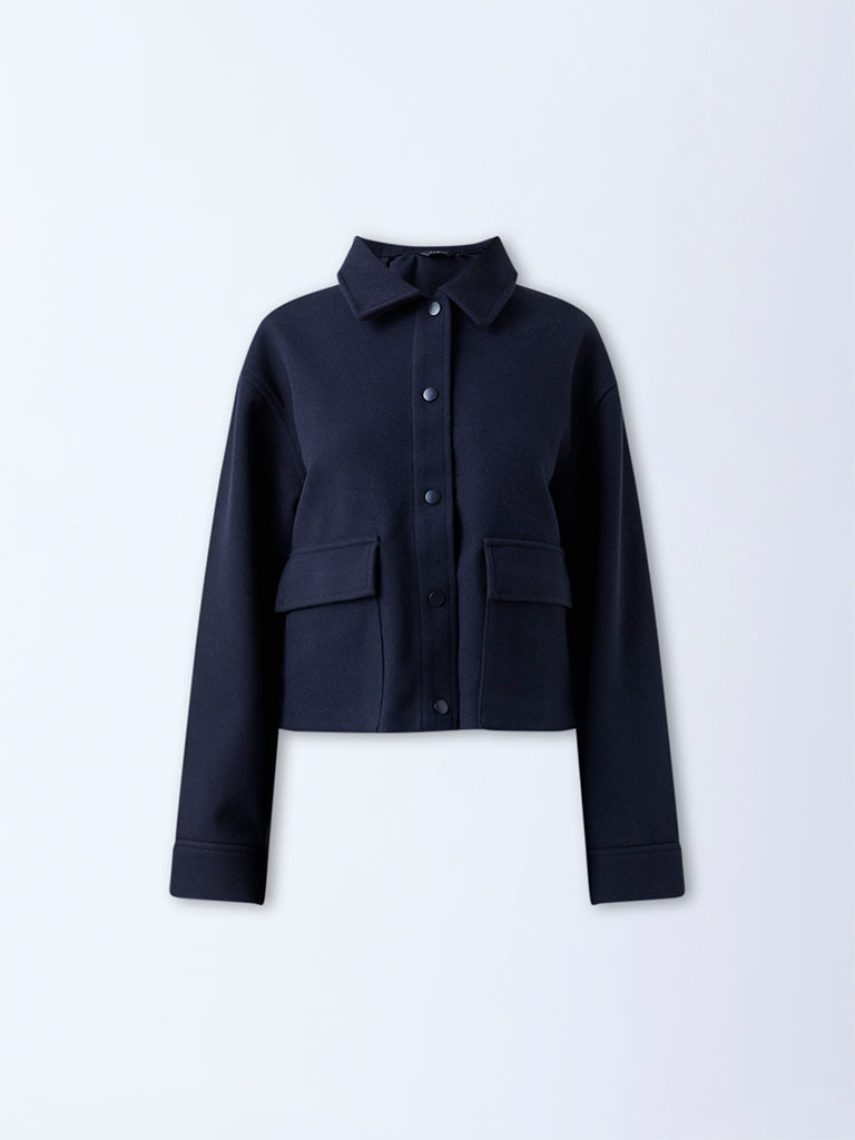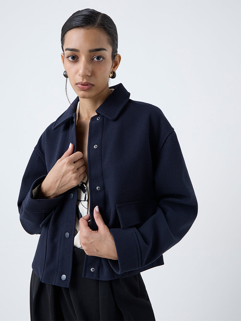 This navy jacket from Wardrobe lends a sharp finish to everyday layering. Crafted from high-quality fabric. it features a structured collar. full sleeves and a snap-button front for a clean look. Detailed with flap pockets. it serves as an effortlessly stylish option for weekday dressing.