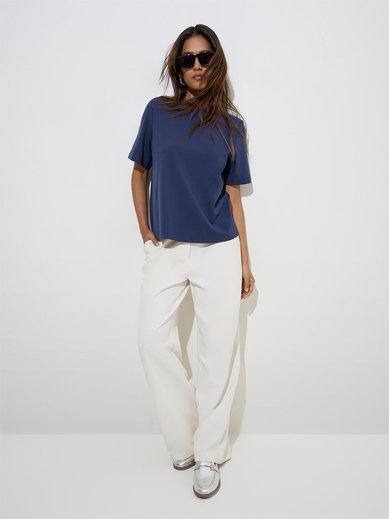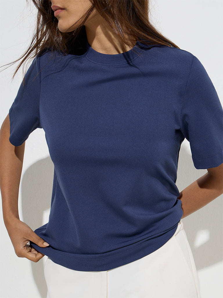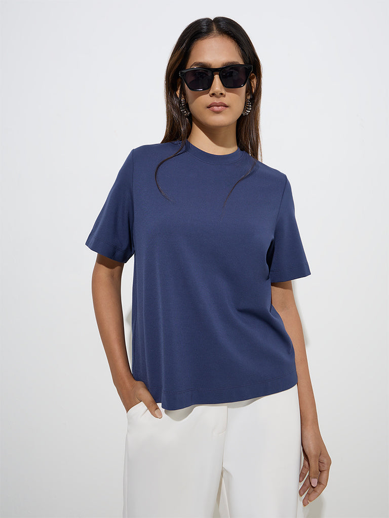 This navy top from Wardrobe is designed in a minimalist profile for effortless style. Spun from a lightweight fabric. it features a classic crew neck and half sleeves.