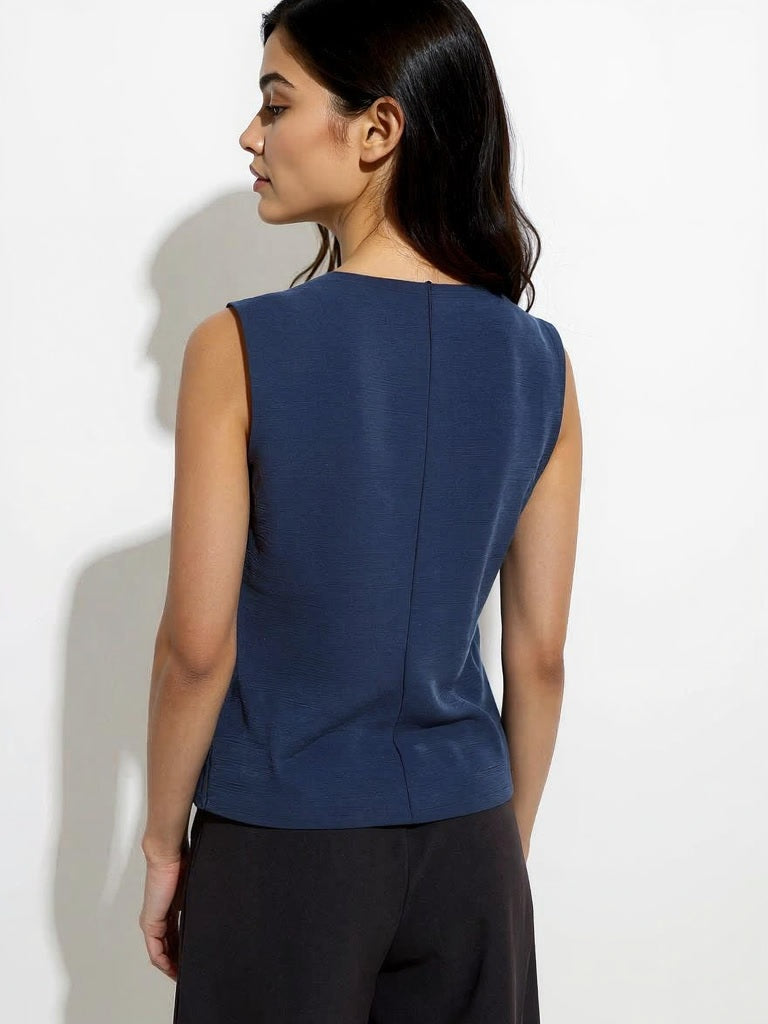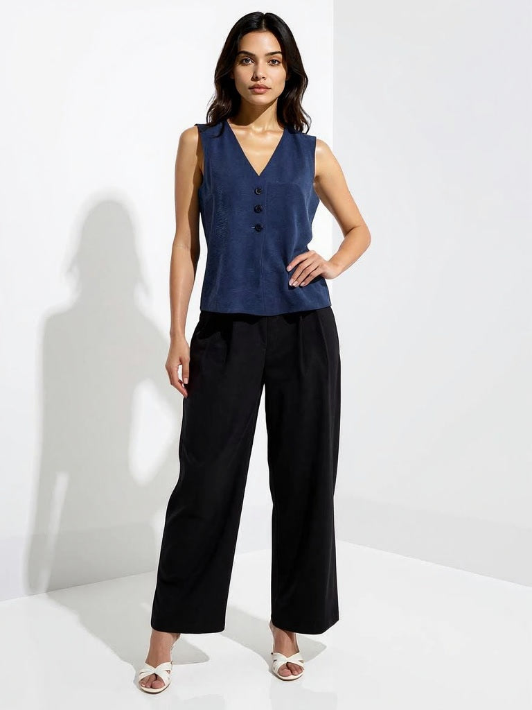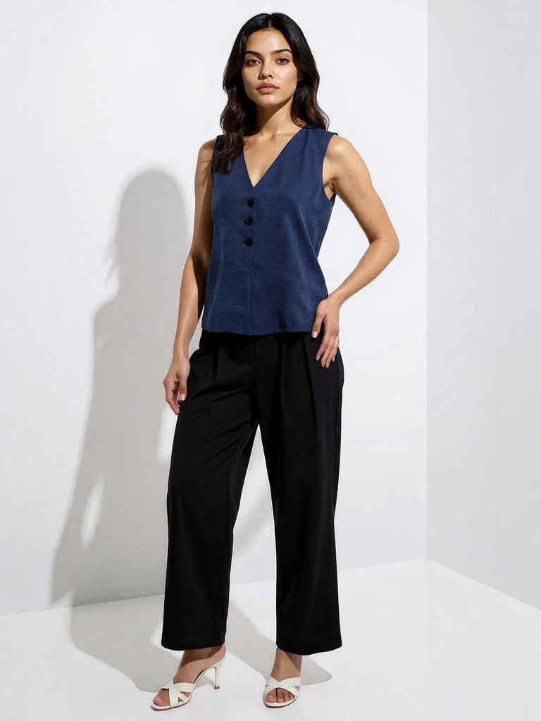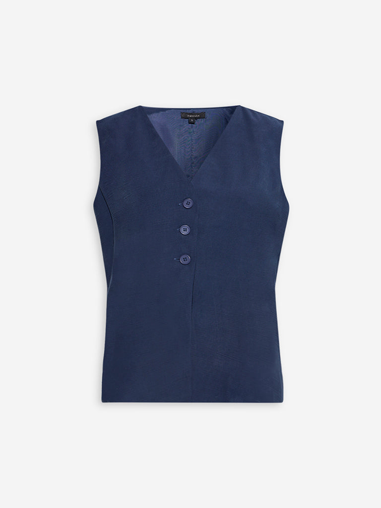 Layer up in sleek style with this navy vest top from Wardrobe. Featuring a solid design. it’s tailored with a sharp V-neck that leads to a three-button placket. The sleeveless cut adds a modern edge. making it a chic piece to elevate both workwear and smart-casual ensembles.