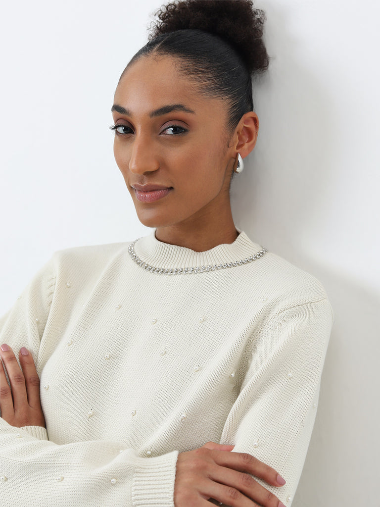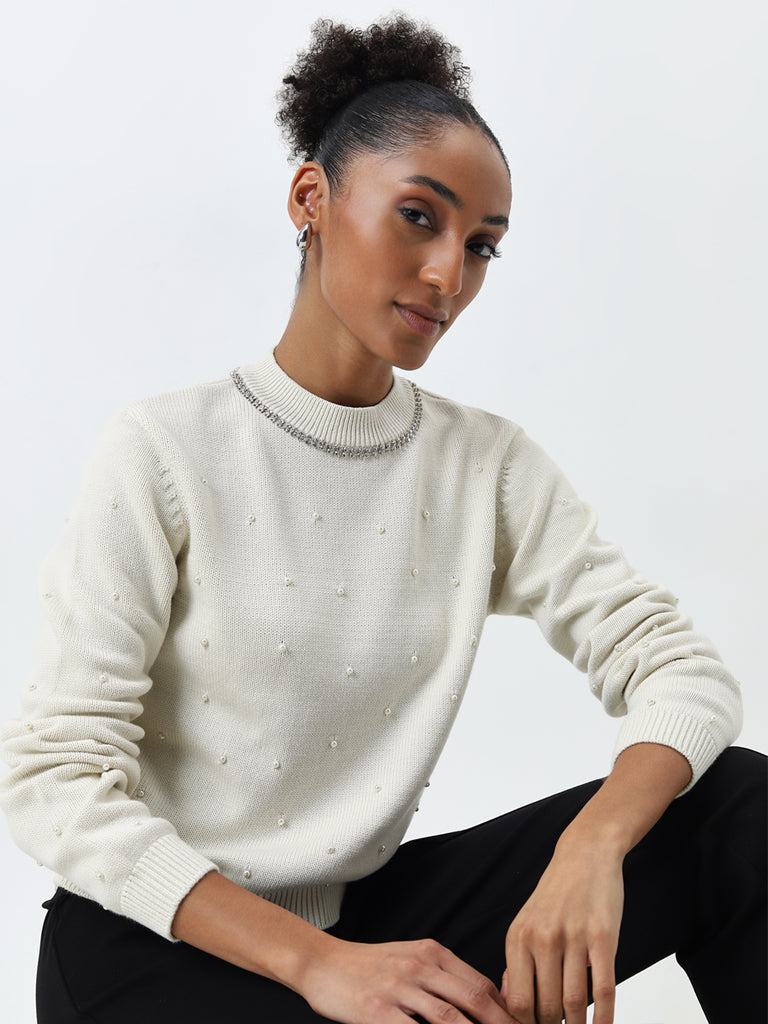 This off-white sweater from Wardrobe features pearl and stone embellishments. The pure cotton winter wear carries a ribbed high-neck and full sleeves.