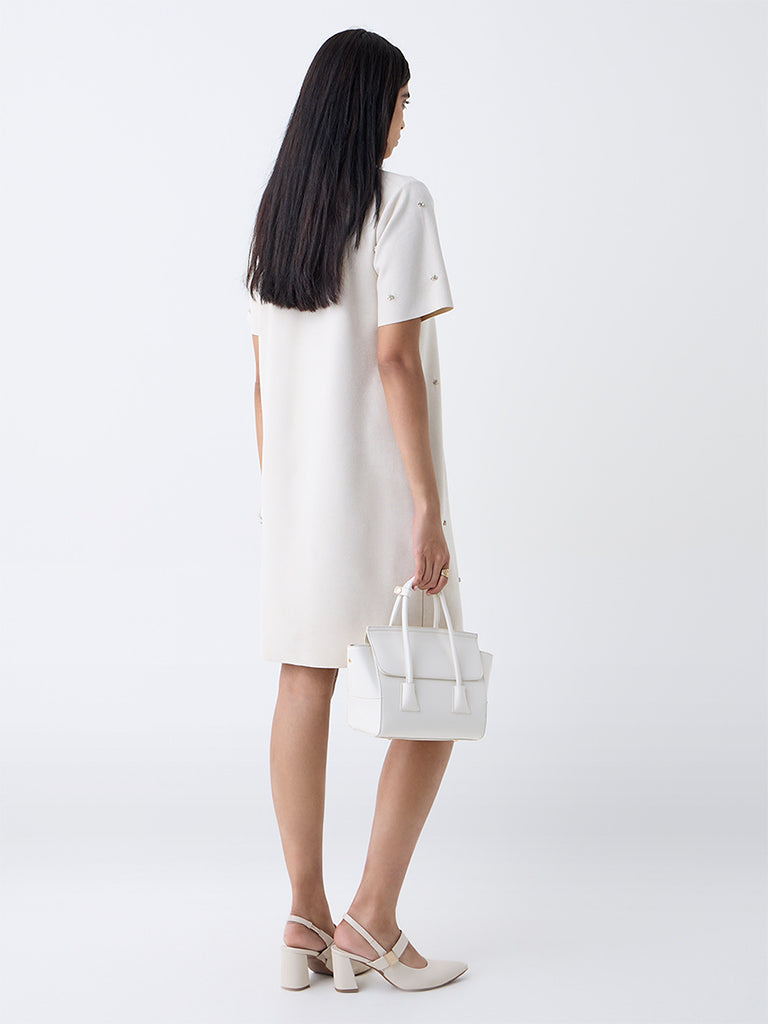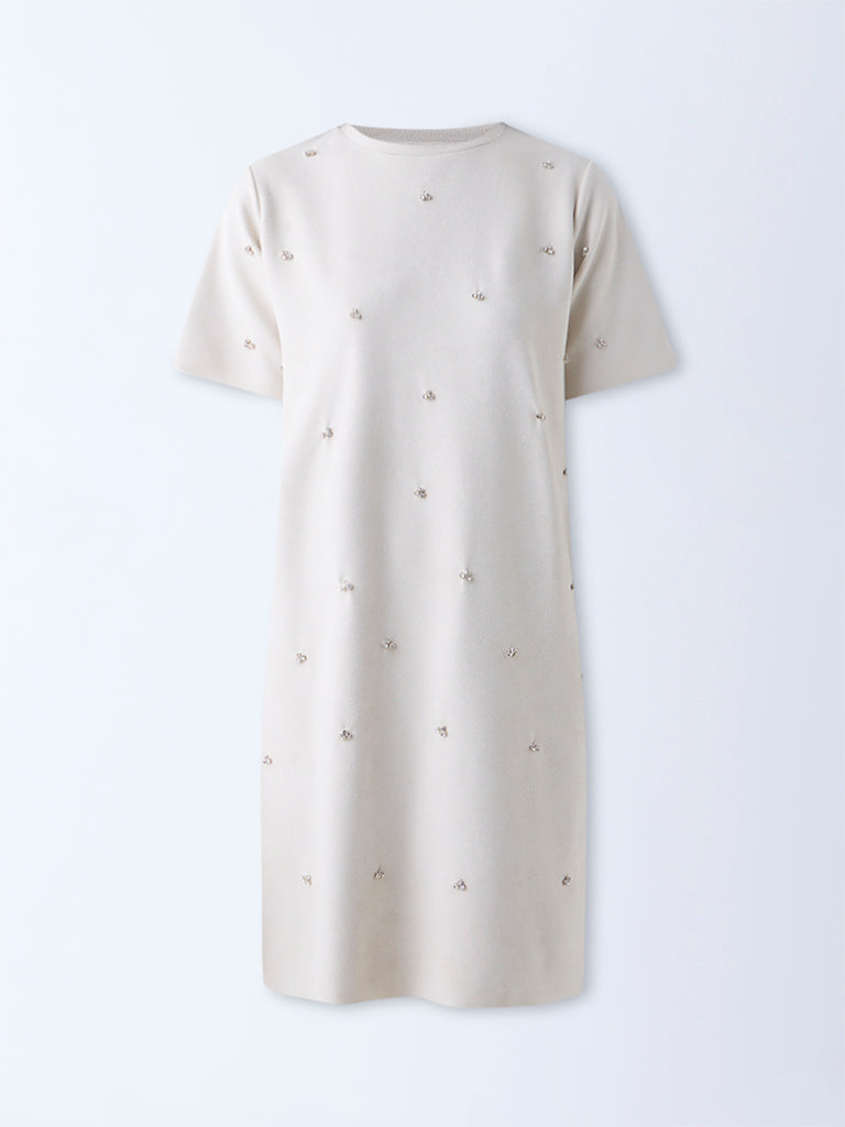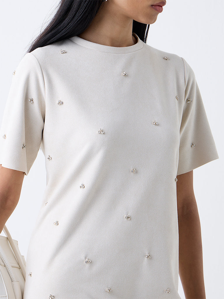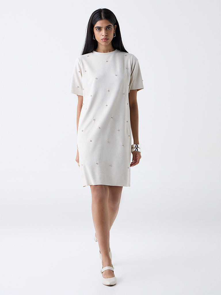 Wardrobe Off-White Faux Suede Diamante-Detailed A-Line Dress