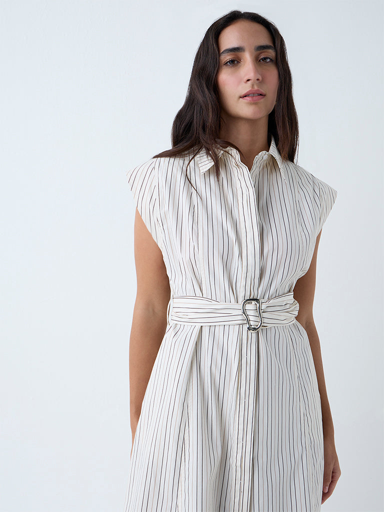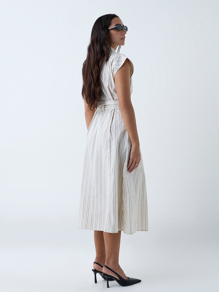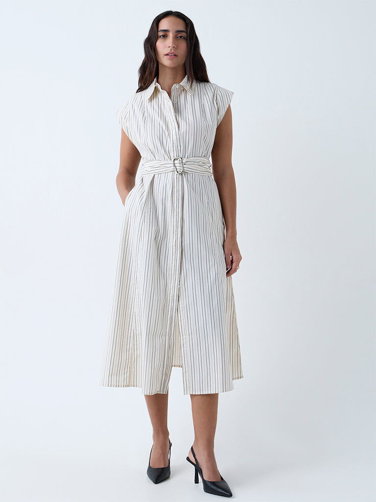 Wardrobe Off-White Stripe Cotton A-Line Dress with Belt