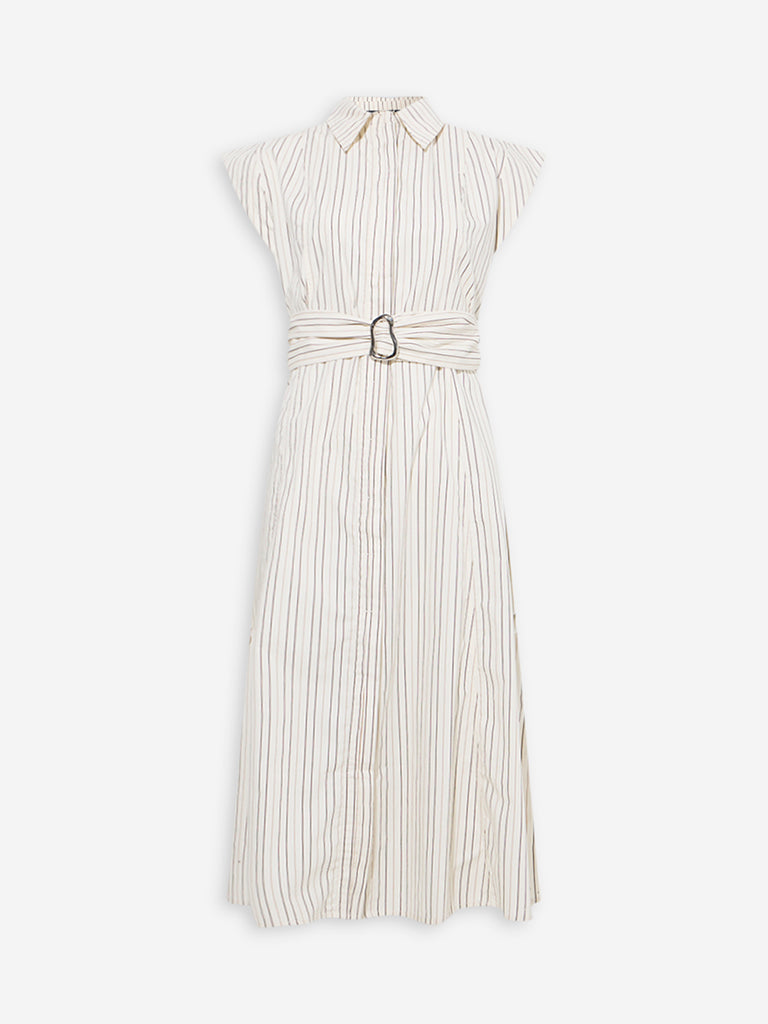 Wardrobe launches this off-white A-line dress elevated with classic stripes and tailored finesse. Milled from a cotton-rich fabric. it features a straight-point collar. concealed button placket. and cap sleeves for a structured look. A matching belt cinches the waist. adding definition to the silhouette.