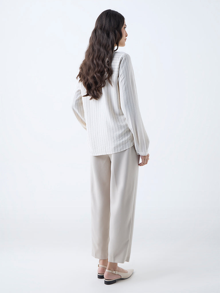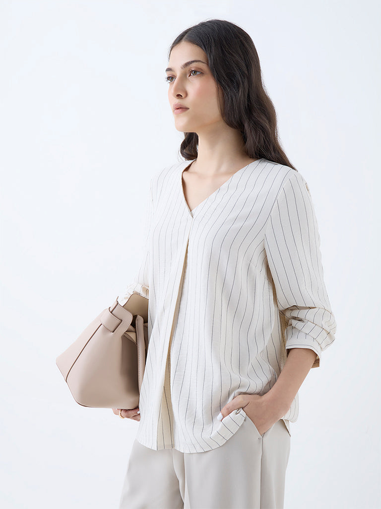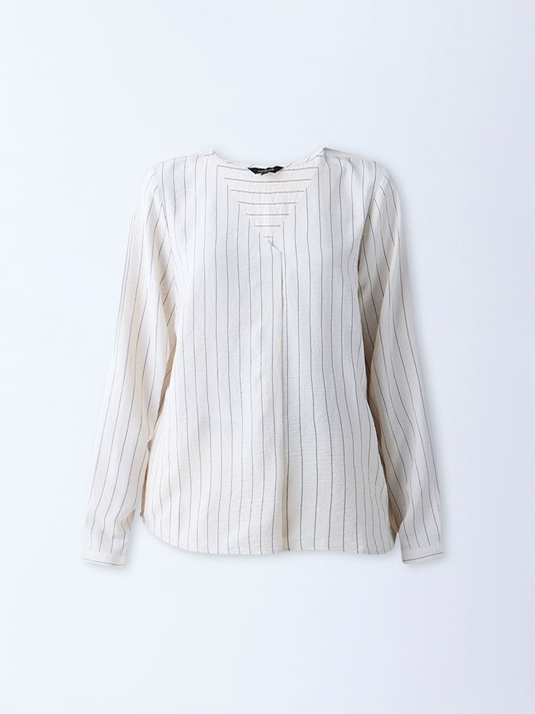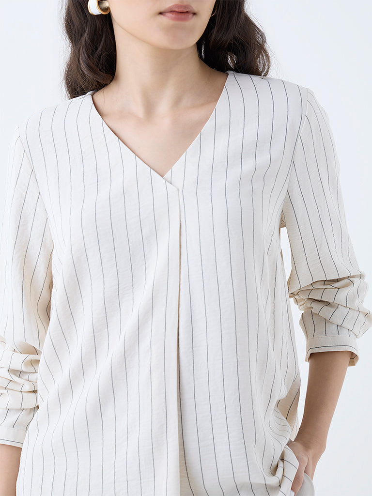 Bring understated sophistication to your wardrobe with this off-white top from Wardrobe. Milled from a breathable fabric and accented with timeless stripe prints. it is designed with a structured V-neck and full sleeves for a polished finish.