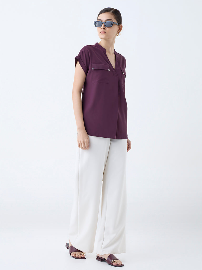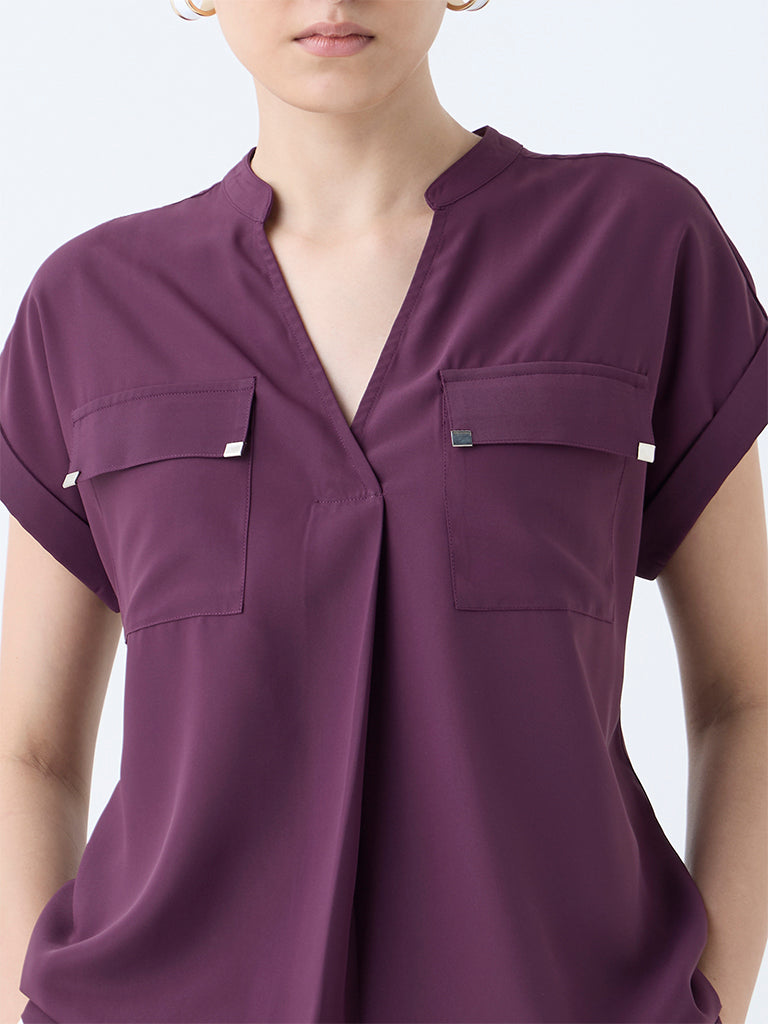 Add a refined touch to your office edit with this plum top from Wardrobe. Styled with a mandarin neck and relaxed dolman sleeves. it features dual chest pockets for a structured finish. Made from a lightweight fabric. it’s a versatile piece that keeps you polished through long workdays and beyond.