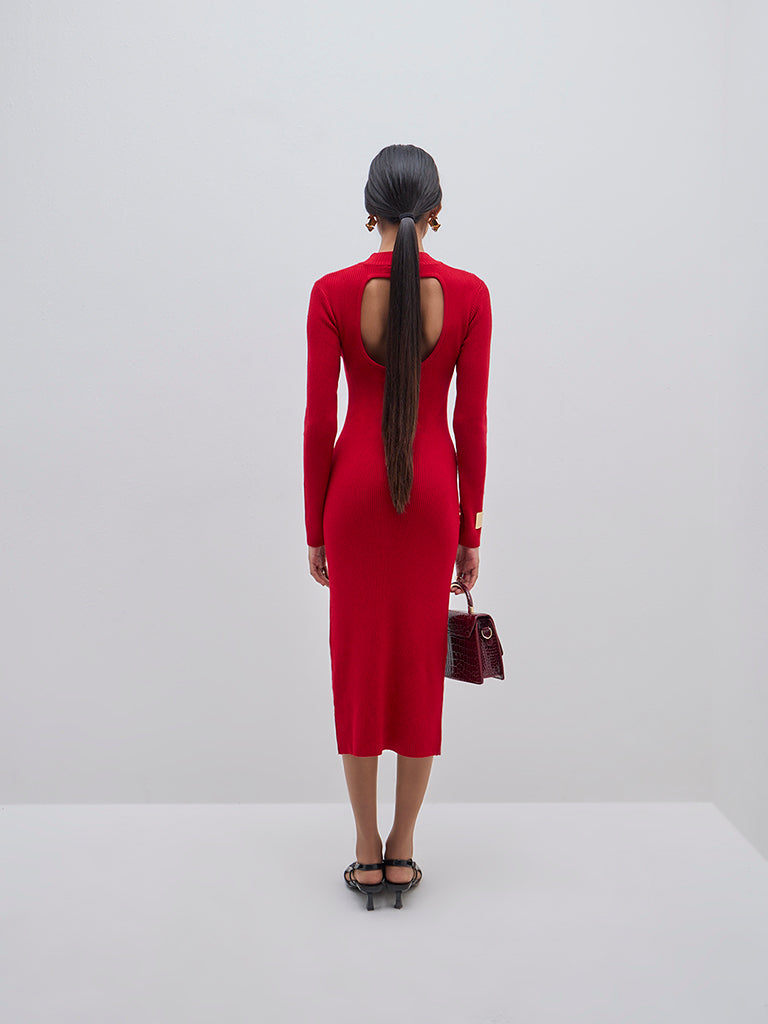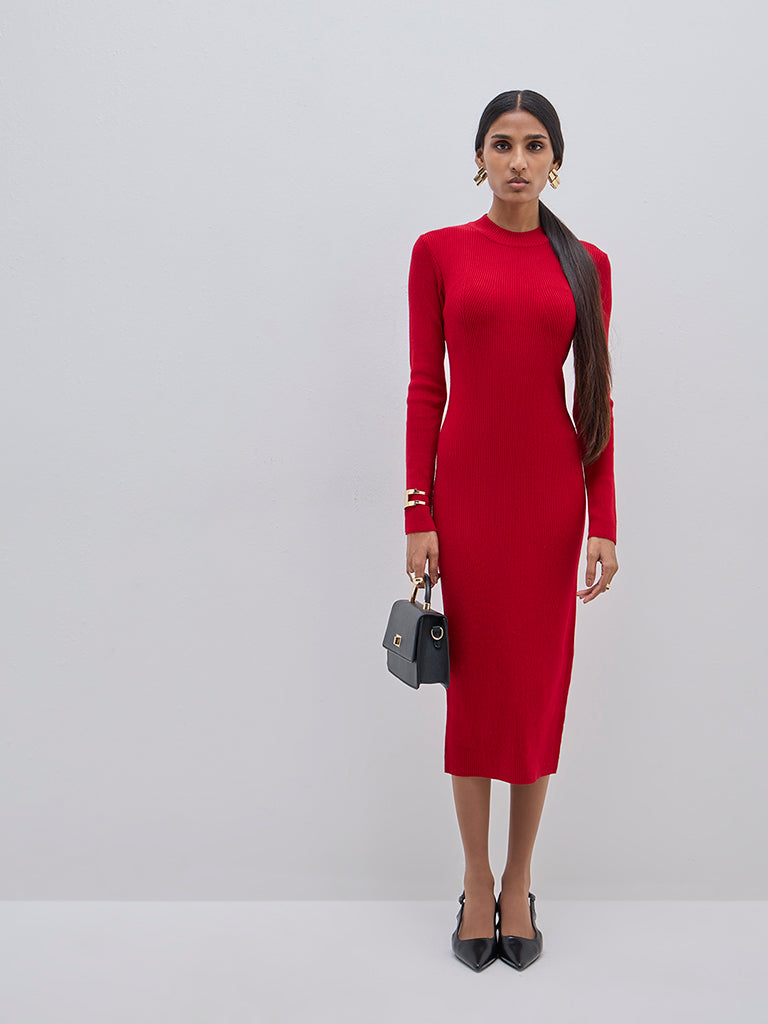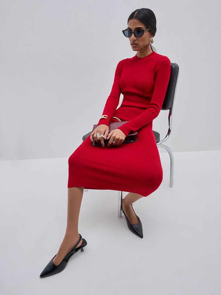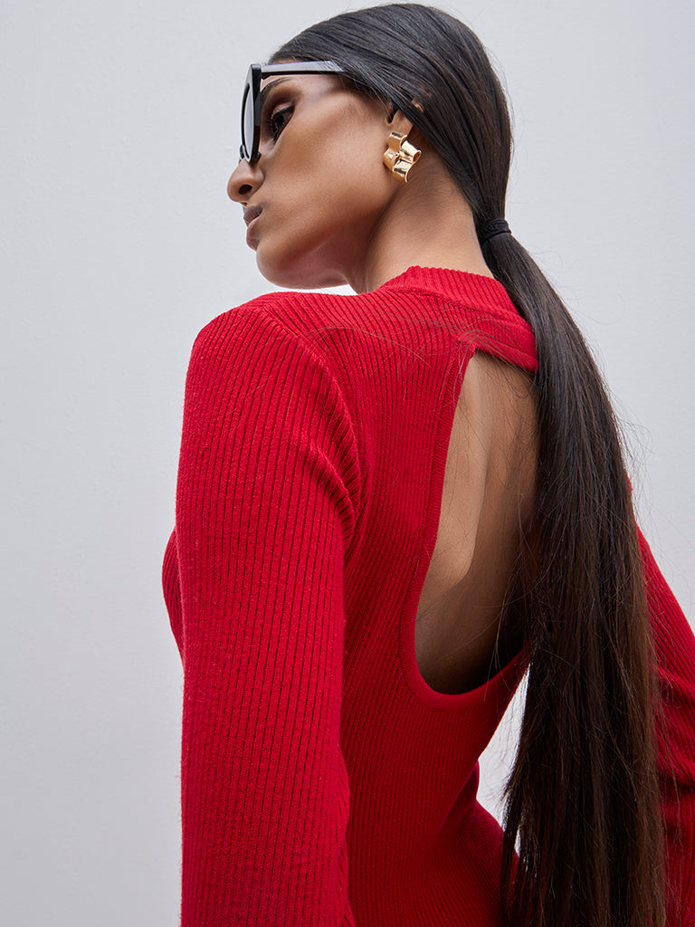 This red dress by Wardrobe is crafted with ribbed dress and a sassy cut-out design at the back. Craved in a bodycon silhouette. the garment comforts with its soft and breathable fabric build. The high-neck and full sleeves complete this dress.