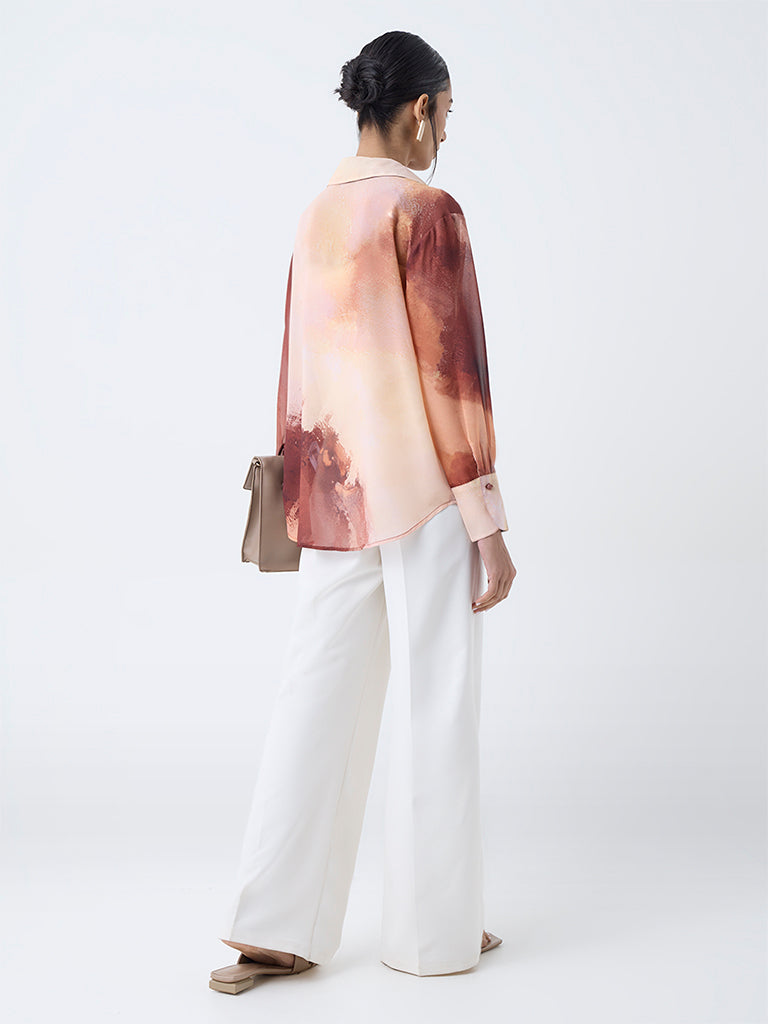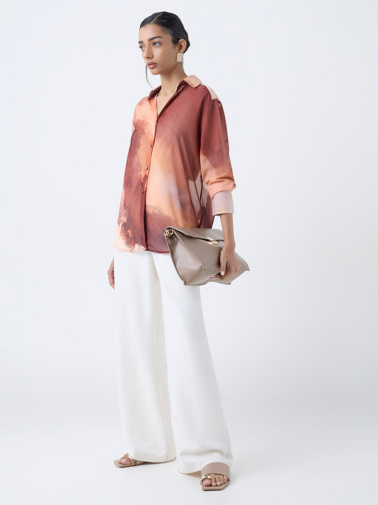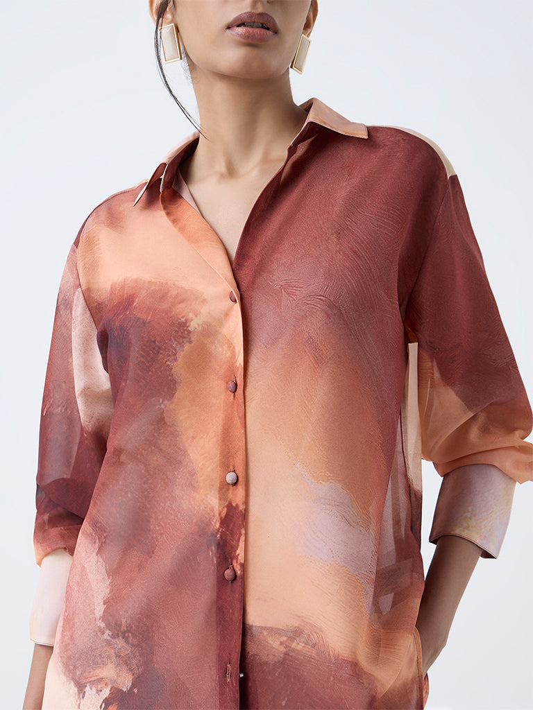 A modern twist on boardroom polish. this rust shirt from Wardrobe is crafted in a sheer marble-printed fabric for a statement yet refined appeal. Designed with a structured collar. button-down front. and full sleeves. it drapes effortlessly over the body. The soft camisole lining ensures comfort and coverage. while allowing the fluid overlay to retain its sheer sophistication.