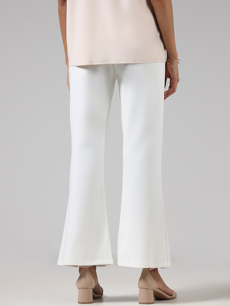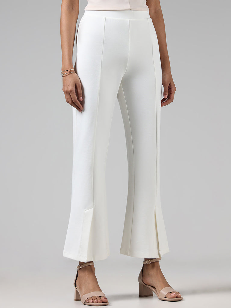 Transform your look with the Wardrobe off white trousers. a sophisticated choice in full-length. off white elegance. Tailored with a high-rise and a sleek front slit cut. these solid ponte trousers exude timeless chic. Top them off flawlessly by pairing with a dark-hued crop top and a sharp blazer for an effortlessly stylish ensemble.