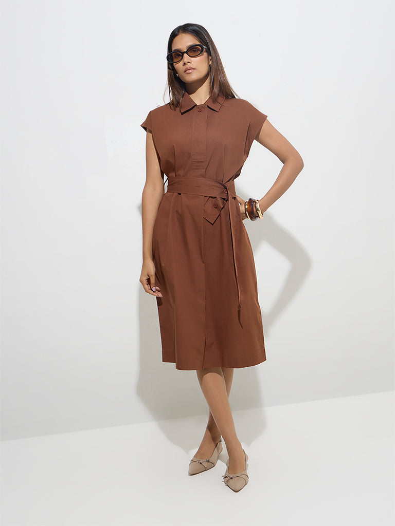 Wardrobe Tan Cotton A-Line Dress with Belt