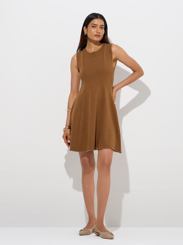 Structured in an A-line silhouette. this tan dress from Wardrobe is crafted from a lightweight fabric for effortless movement. With a round neck and sleeveless design. this minimalist piece adds a touch of elegance. making it ideal for both daytime events and evening occasions.