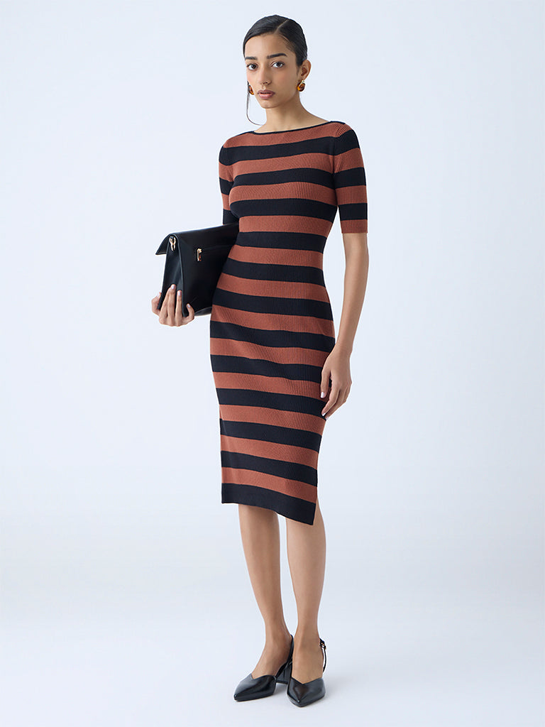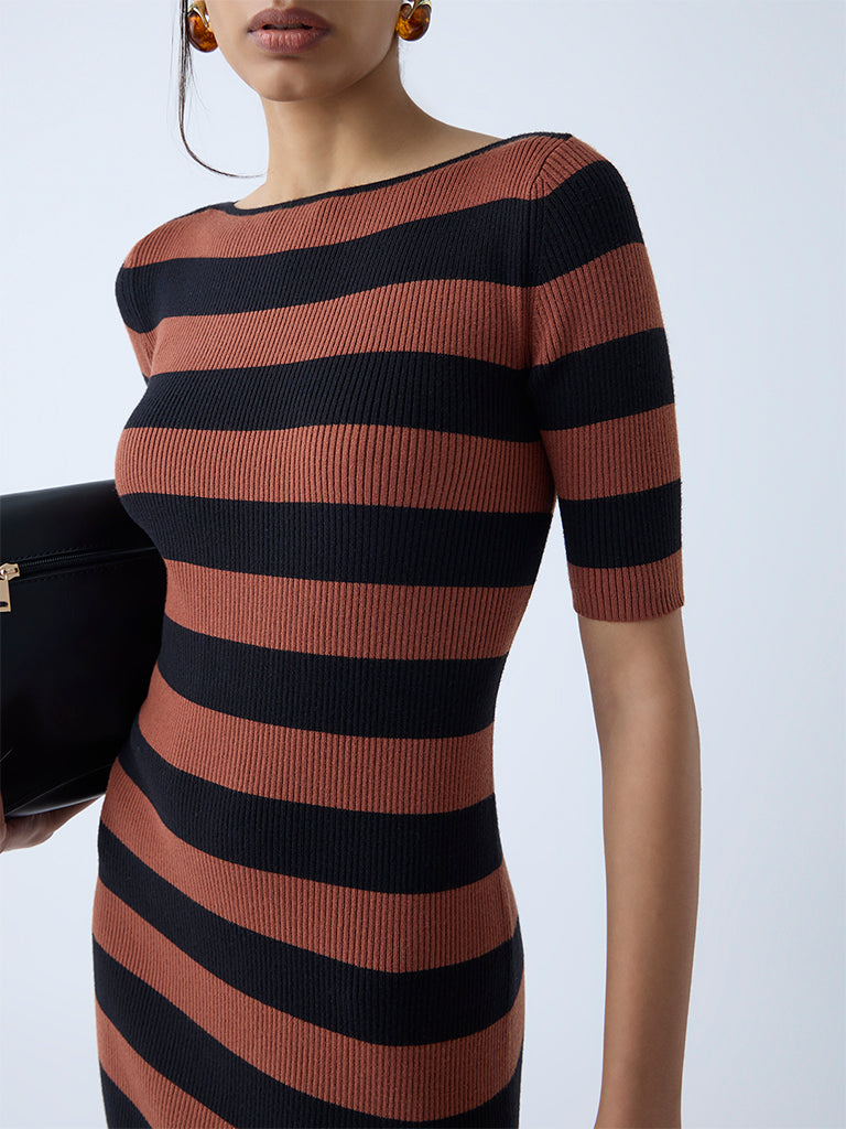 Contemporary and confident. this tan bodycon dress from Wardrobe features a refined stripe pattern that elongates the frame. Crafted from stretch-infused ribbed fabric. it’s styled with a boat neckline. short sleeves. and a subtle slit at the hem for added movement.
