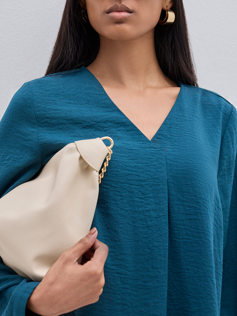 This teal top by Wardrobe features crinkled design. The soft and breathable fabric garment is structured with a V-neck and fill sleeves.