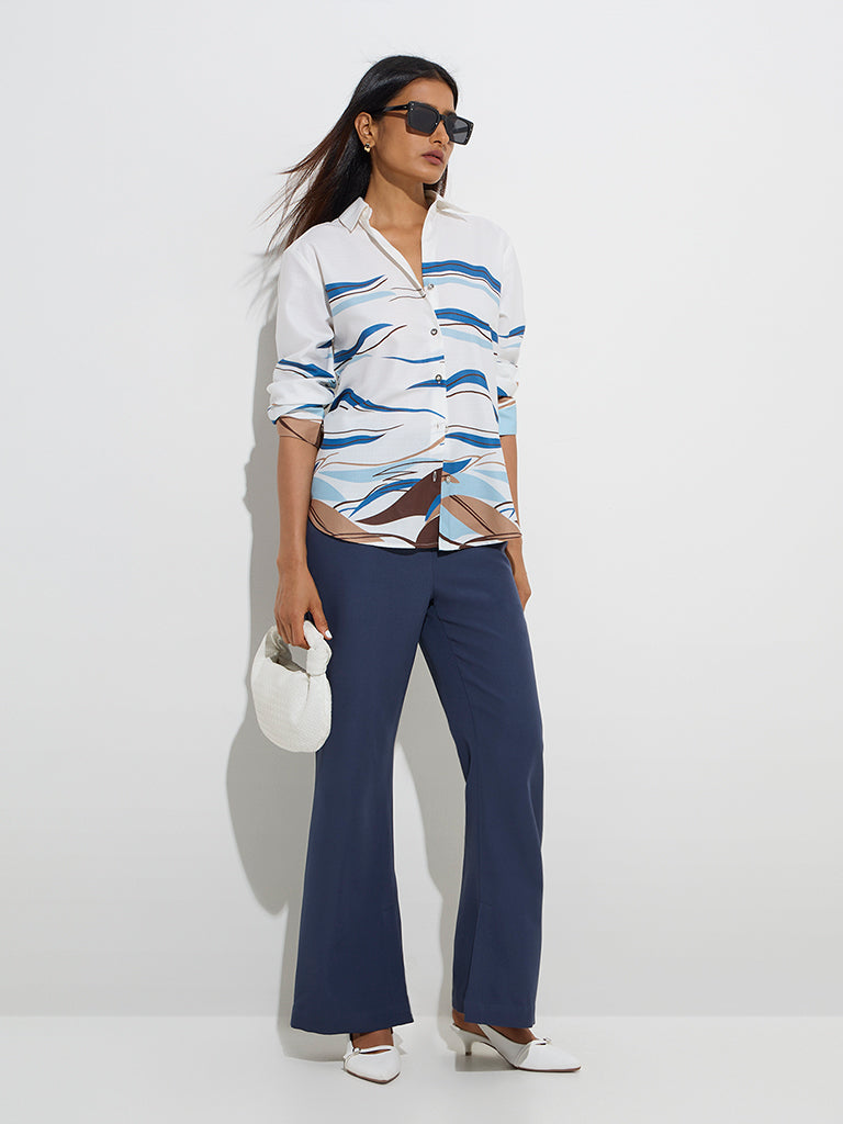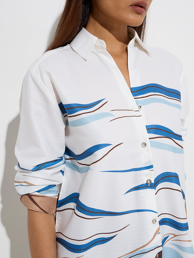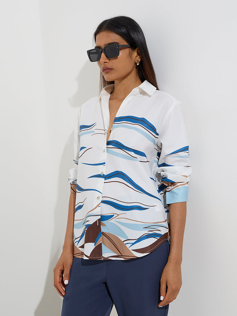 Crafted from quality fabric. this white shirt by Wardrobe is adorned with a vibrant abstract print for a striking appeal. It features a smart collar. button placket. and full sleeves. making it a versatile pick for both work and weekend wear.